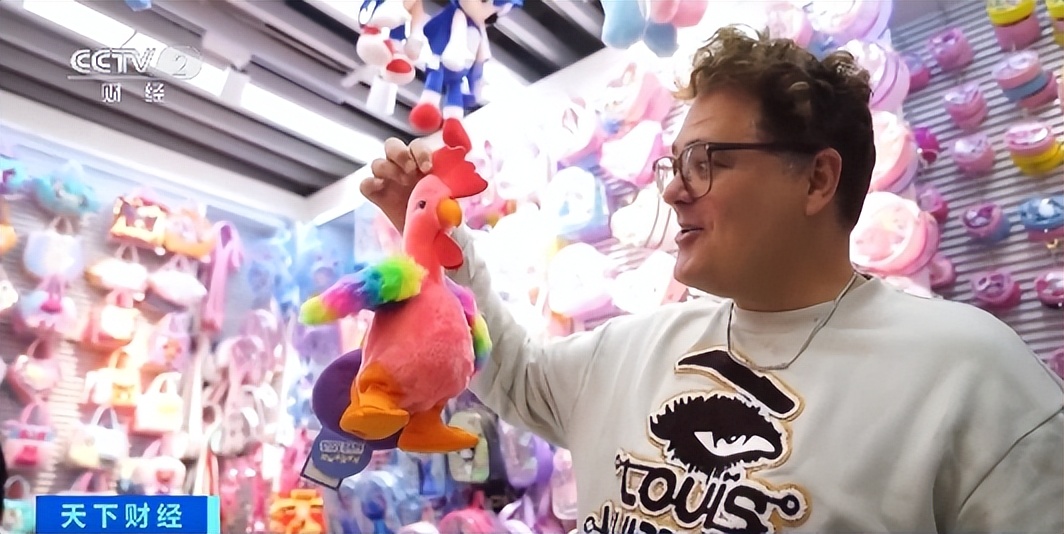 不光是体育用品,法国元素的纪念品、工艺品也纷纷大卖,一家店铺的经典款埃菲尔铁塔,已连续补了好几次货。而不少带有法国元素的电子产品也备受青睐,在一家玩具店铺,荷兰采购商罗马诺被一只电子公鸡吸引。