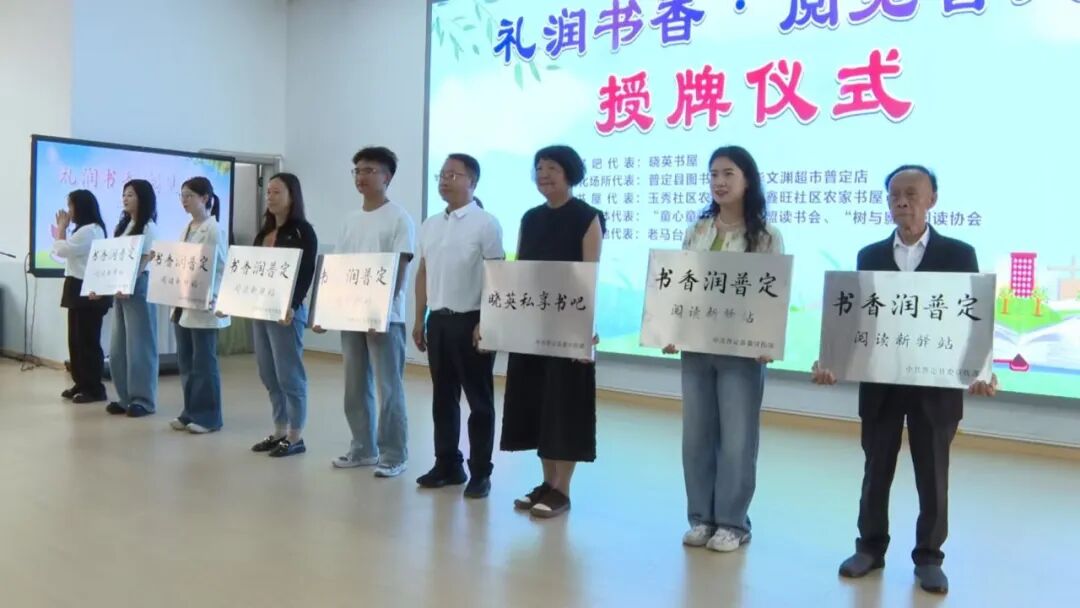 活动伊始,宋洪为活动致辞,并先后为8个阅读点代表授牌,其中,“晓英书屋”获授“晓英私享书吧”牌匾,普定县图书馆、普定县城市书房、玉秀社区农家书屋等7个阅读点均获授“书香润普定 阅读新驿站”称号。