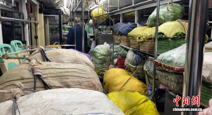 图为菜农将蔬菜等搬上公交车。 杨凯茗 摄