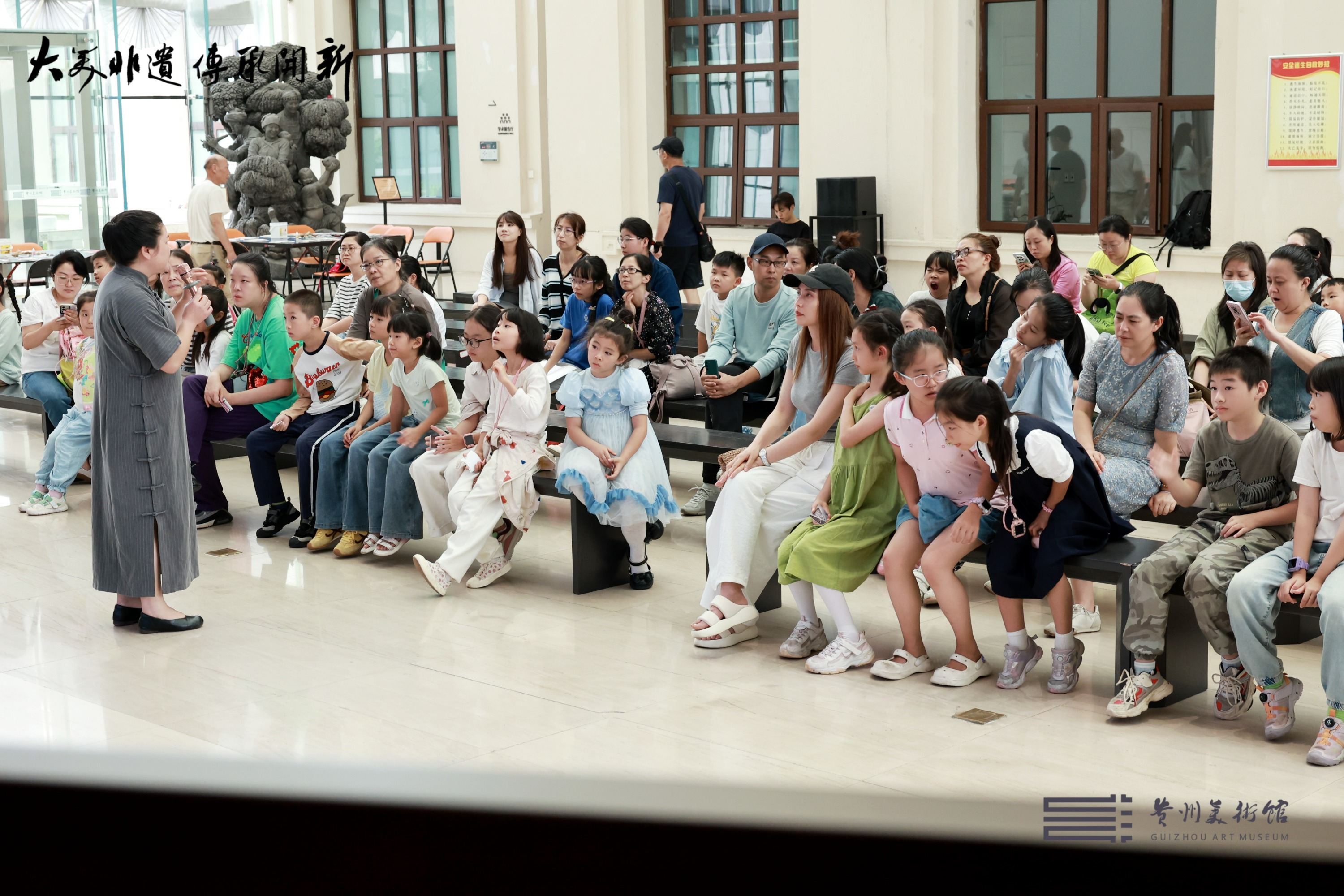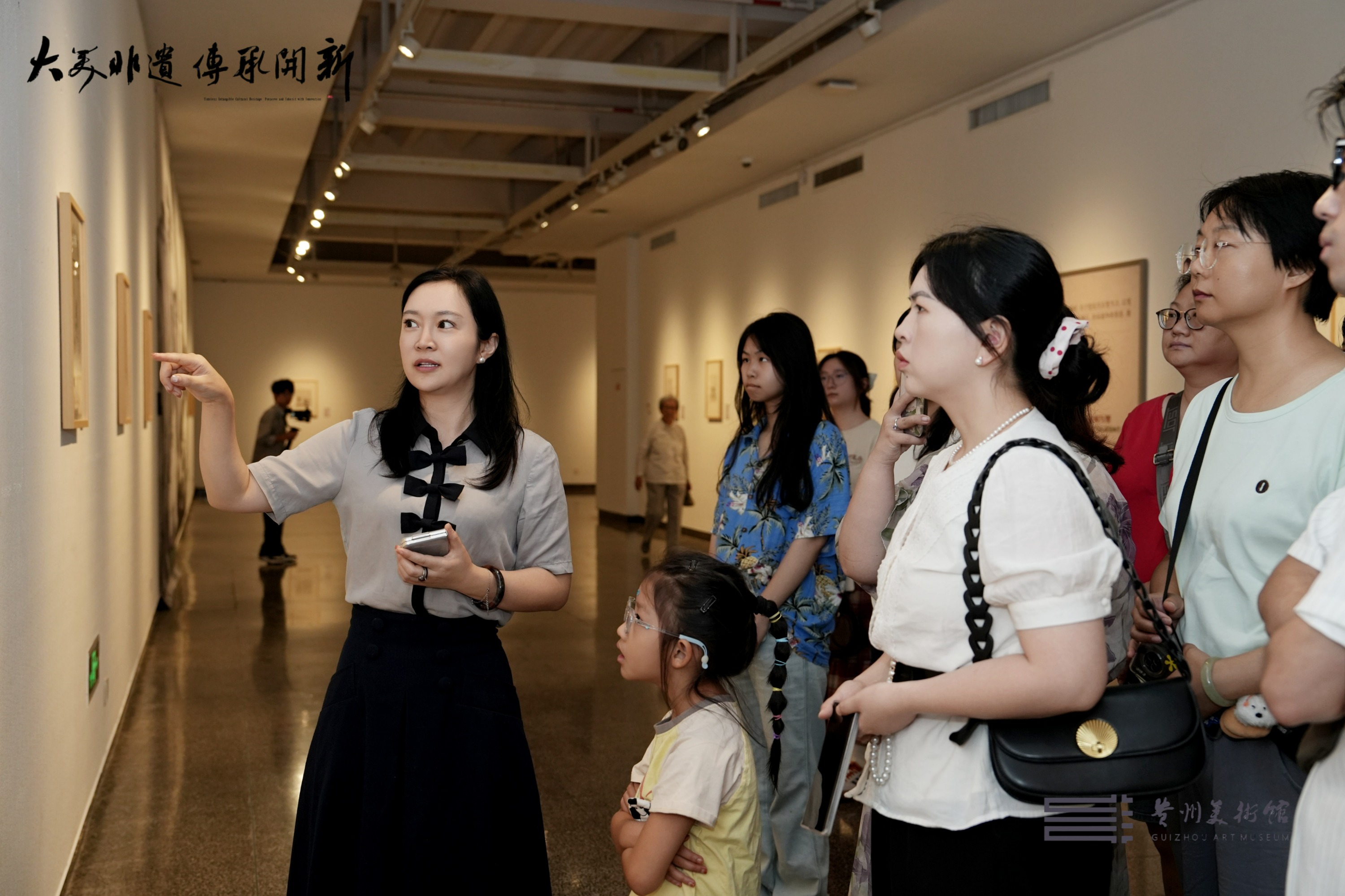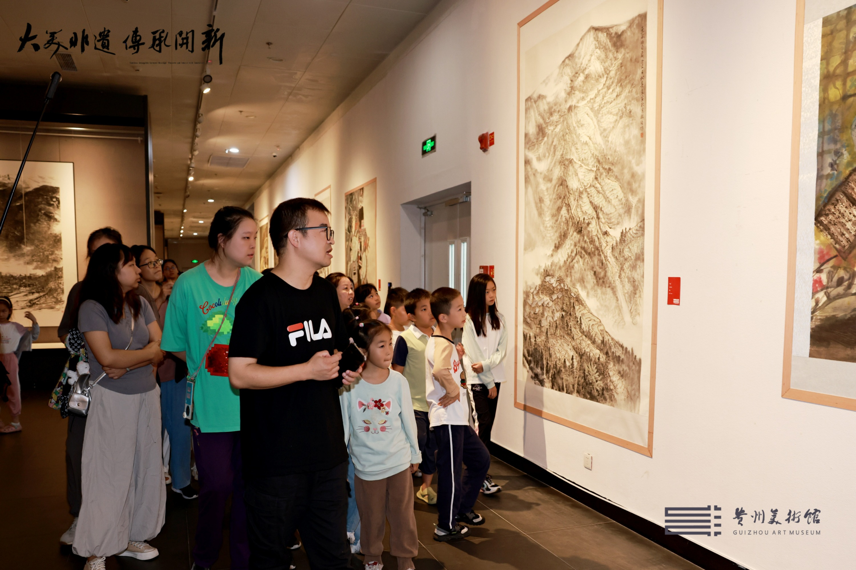 美术馆艺术鉴赏环节中,主要由中国美术家协会会员、贵州画院(贵州美术馆)专职画家、典藏展陈部副主任傅斌和贵州画院(贵州美术馆)社教公关部副主任阮珊珊带领现场的亲子家庭和青年们参观《山河万里——丰子恺抗战漫画作品展》。他们以丰子恺先生的漫画作品展为媒介,生动讲解了作品背后承载的抗战历史,引领大家感受其在烽火岁月中所彰显的深沉爱国情怀与不屈文人风骨。现场观众凝神聆听,跟随两位老师的讲解细致观展,沉浸于这段充满力量的艺术与历史对话之中。