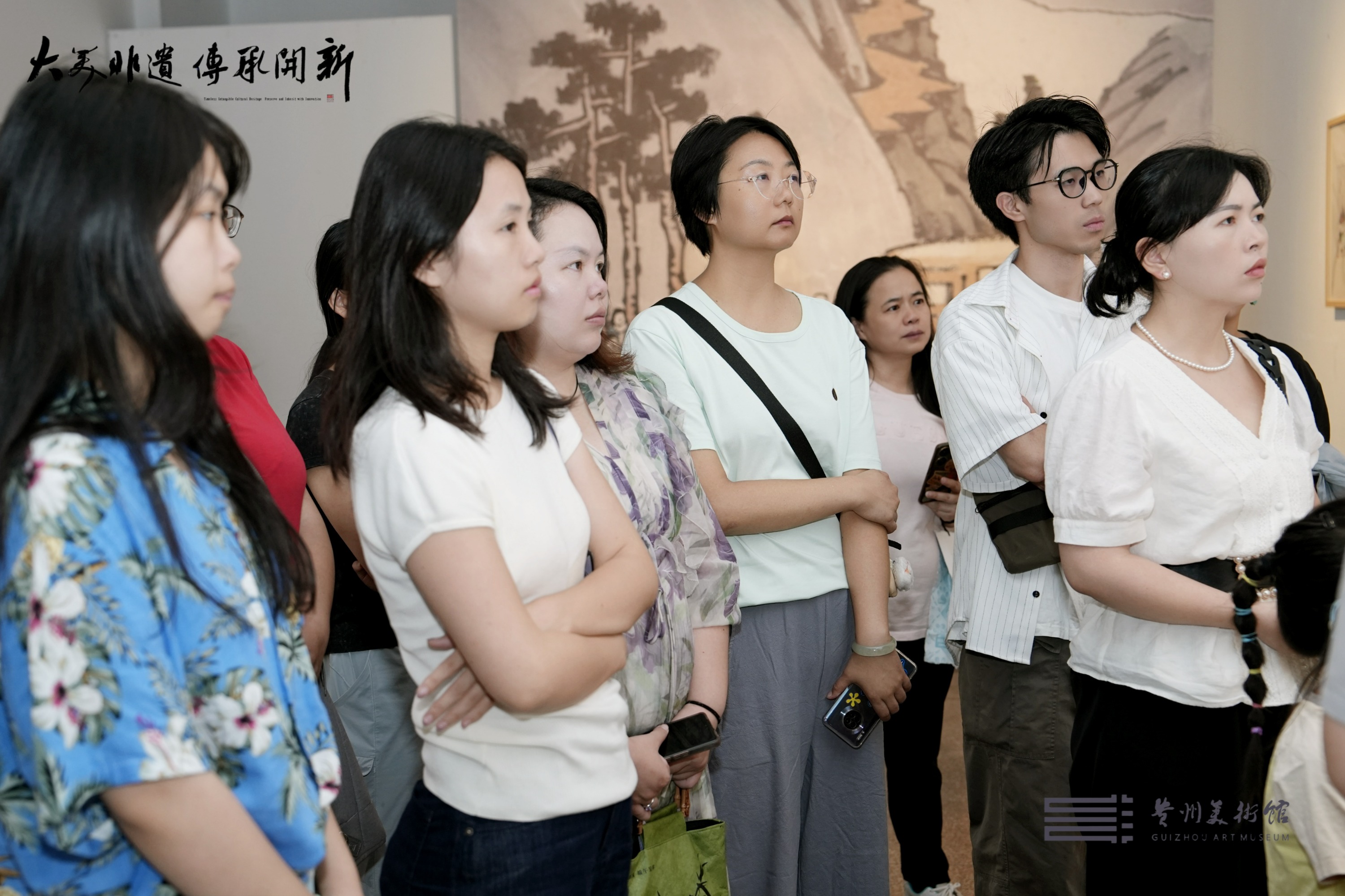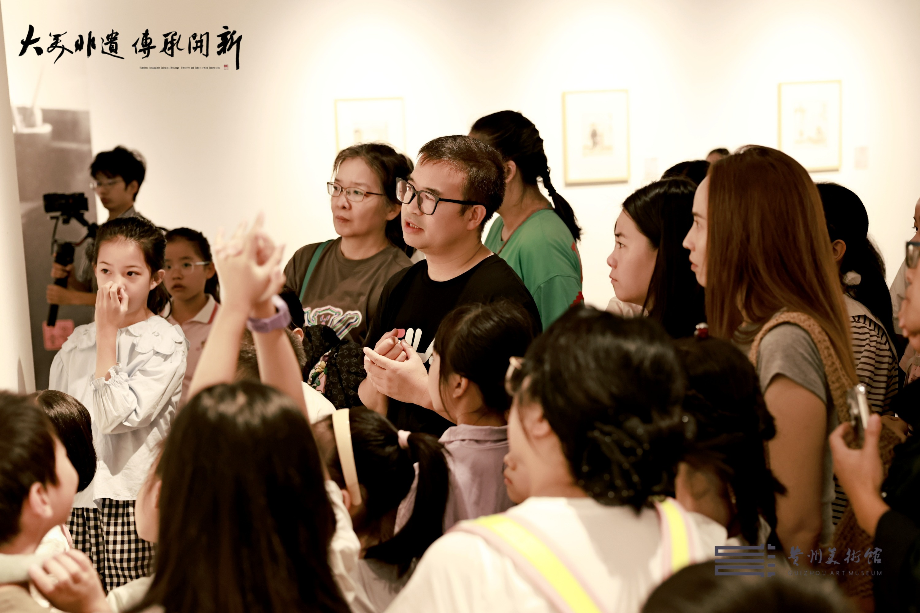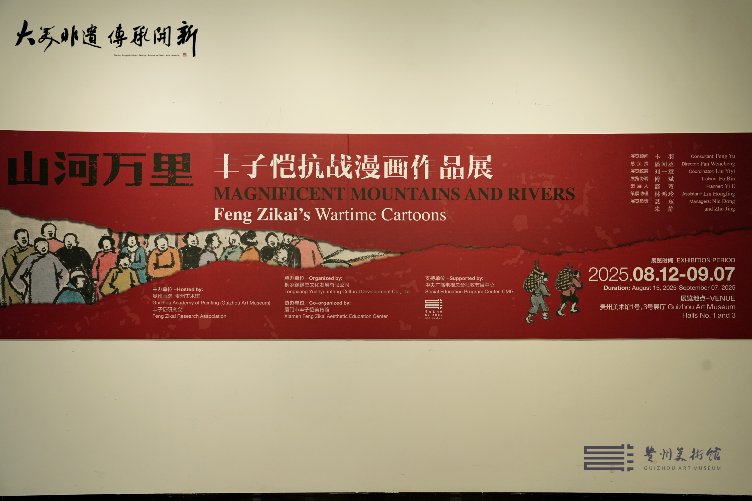 美术馆艺术鉴赏环节中,主要由中国美术家协会会员、贵州画院(贵州美术馆)专职画家、典藏展陈部副主任傅斌和贵州画院(贵州美术馆)社教公关部副主任阮珊珊带领现场的亲子家庭和青年们参观《山河万里——丰子恺抗战漫画作品展》。他们以丰子恺先生的漫画作品展为媒介,生动讲解了作品背后承载的抗战历史,引领大家感受其在烽火岁月中所彰显的深沉爱国情怀与不屈文人风骨。现场观众凝神聆听,跟随两位老师的讲解细致观展,沉浸于这段充满力量的艺术与历史对话之中。