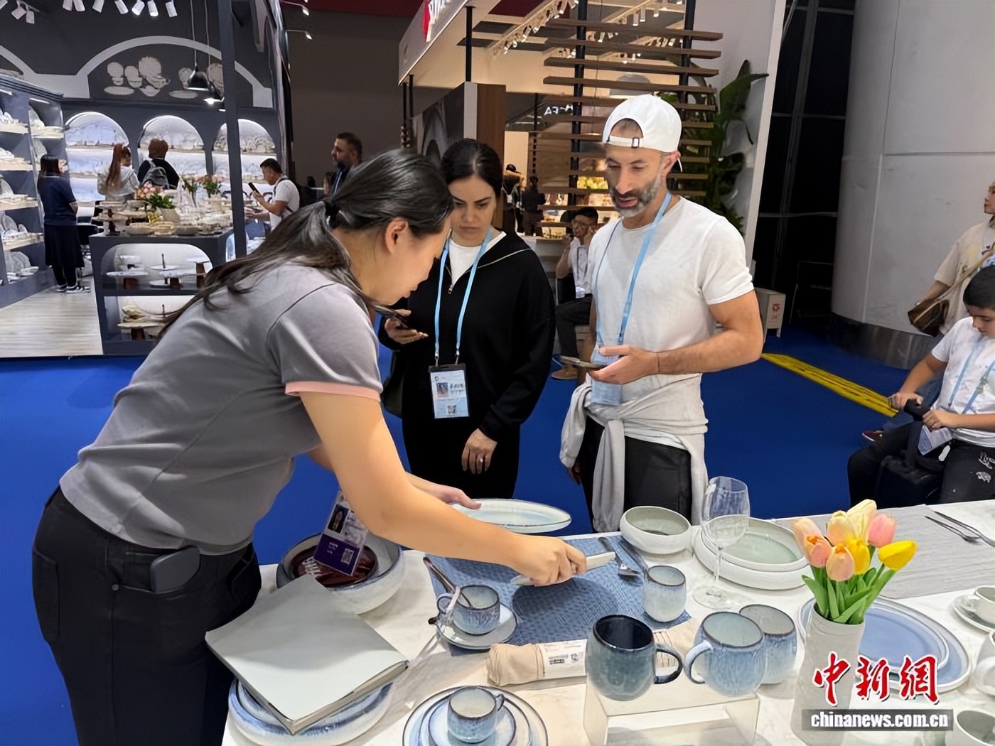 10月23日,第138届广交会第二期开幕。图为境外采购商在一家销售陶瓷餐具的企业前询盘。中新社记者 蔡敏婕 摄