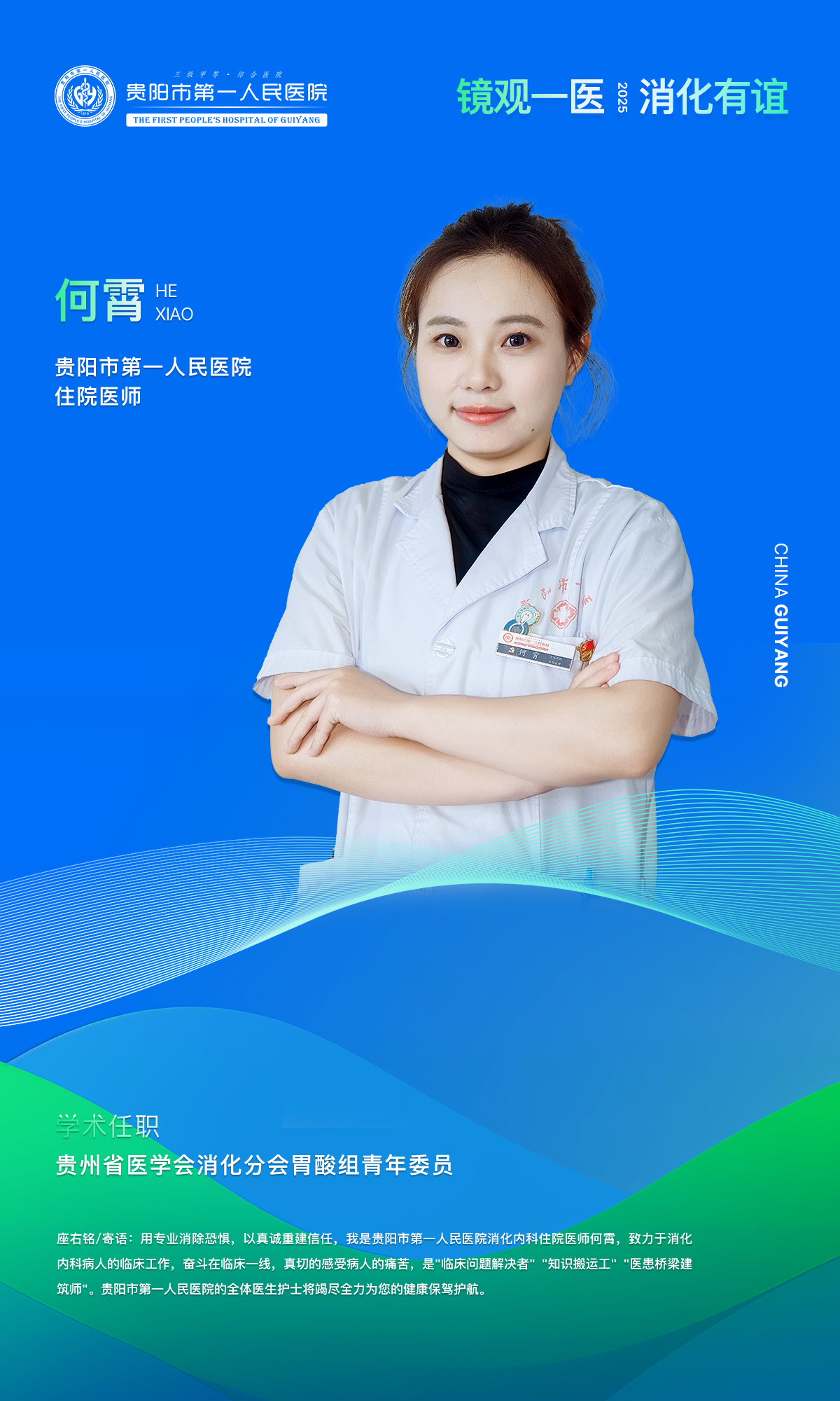 用专业消除恐惧,以真诚重建信任,她是贵阳市第一人民医院消化内科住院医师何霄。致力于消化内科病人的临床工作,奋斗在临床一线,真切的感受病人的痛苦,是“临床问题解决者”“知识搬运工”“医患桥梁建筑师”。贵阳市第一人民医院的全体医生护士将竭尽全力为您的健康保驾护航。