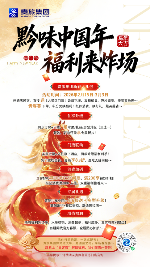 2月15日至3月3日,贵旅集团特别推出“黔味中国年、新春大礼包”活动,吃住行游购娱一网打尽。