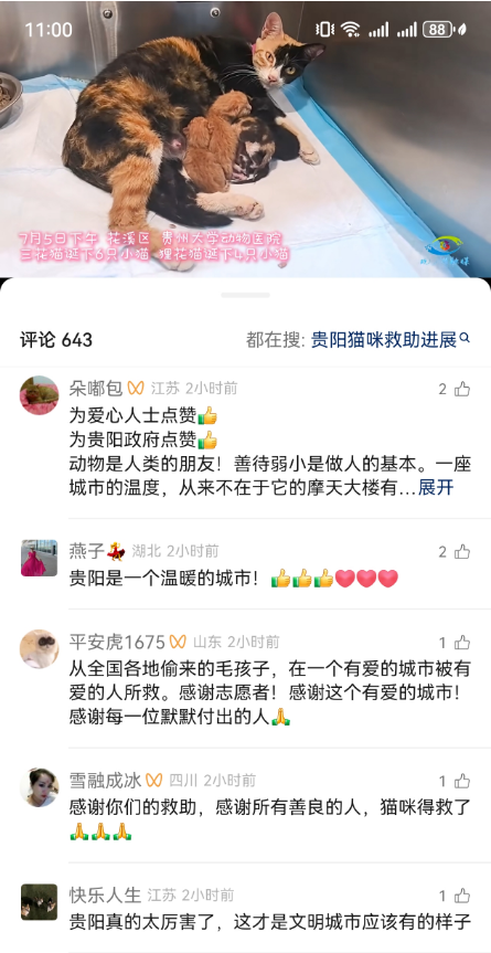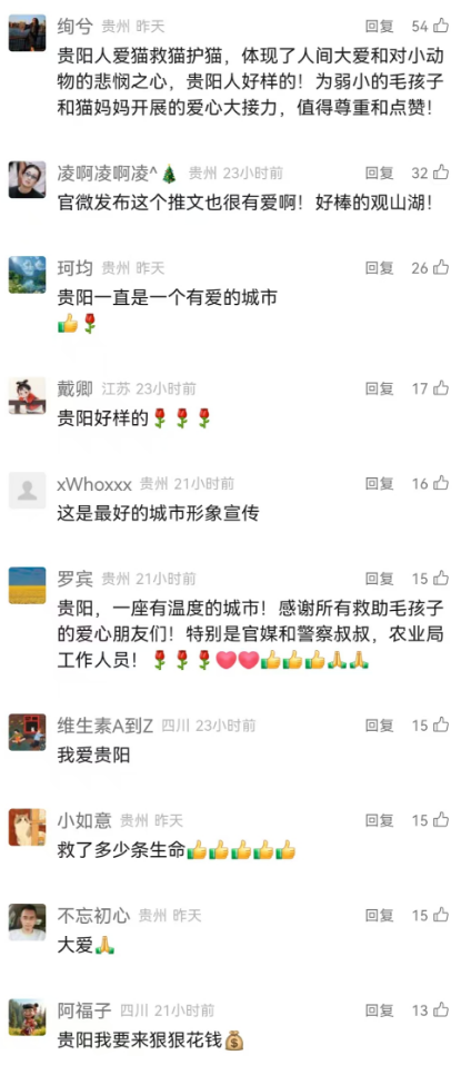 “贵阳上大分”“贵阳,一座有温度的城市”“贵阳人爱猫救猫护猫,体现了人间大爱和对小动物的悲悯之心”“政府部门、志愿者和全国众多热心群众共同用爱心创造了生命的奇迹”“这才是文明城市应该有的样子”“这是最好的城市形象宣传片……”前期,该事件经贵阳市观山湖区融媒体中心持续报道后,广大网友纷纷留言点赞贵阳这座有爱的城市。在爱心志愿者、相关部门及宠物医院等各方一个多月的共同努力下,四百多只猫咪中的绝大多数现都已恢复了健康。