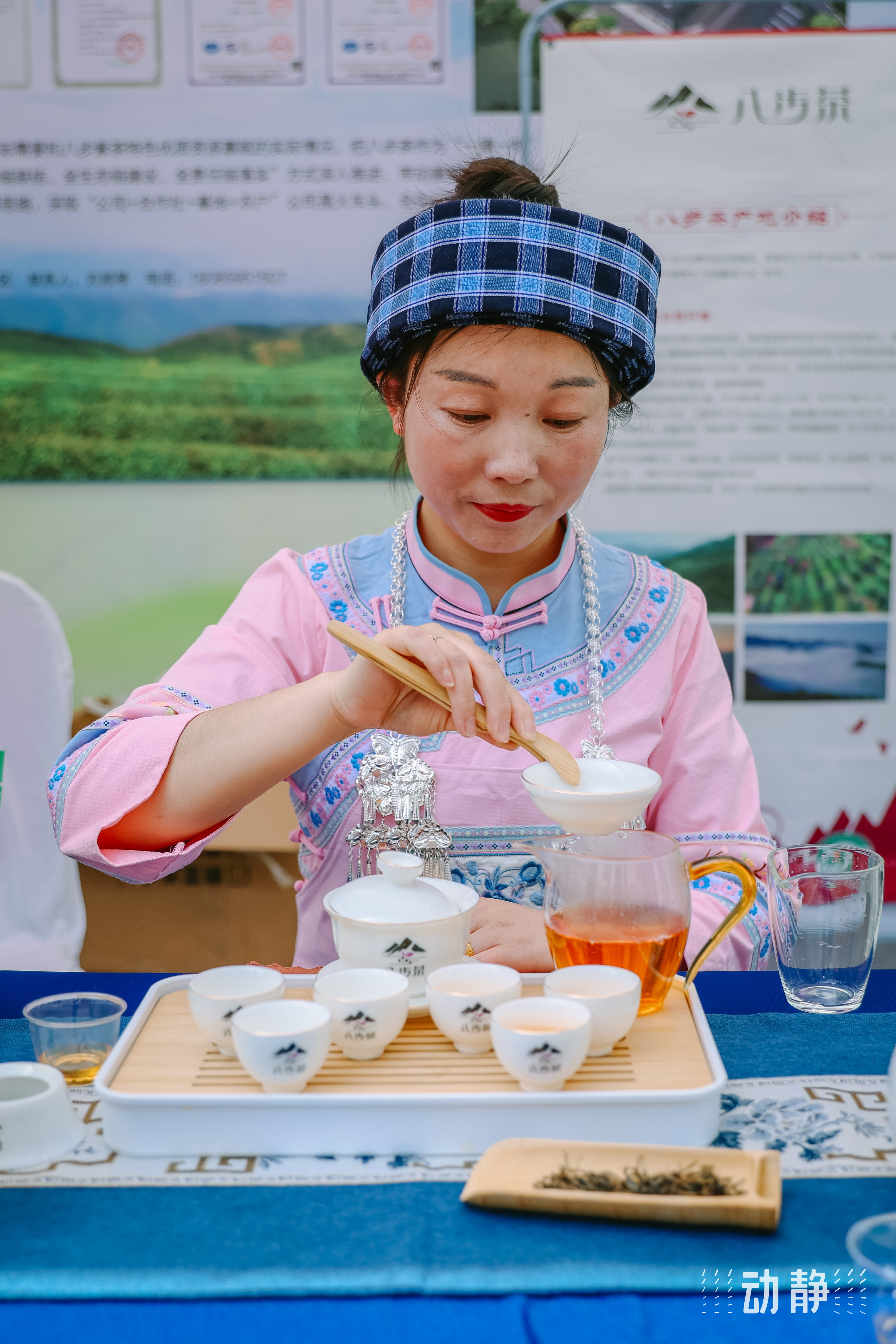 身着布依族服饰的茶艺师向参观者进行茶艺展示
