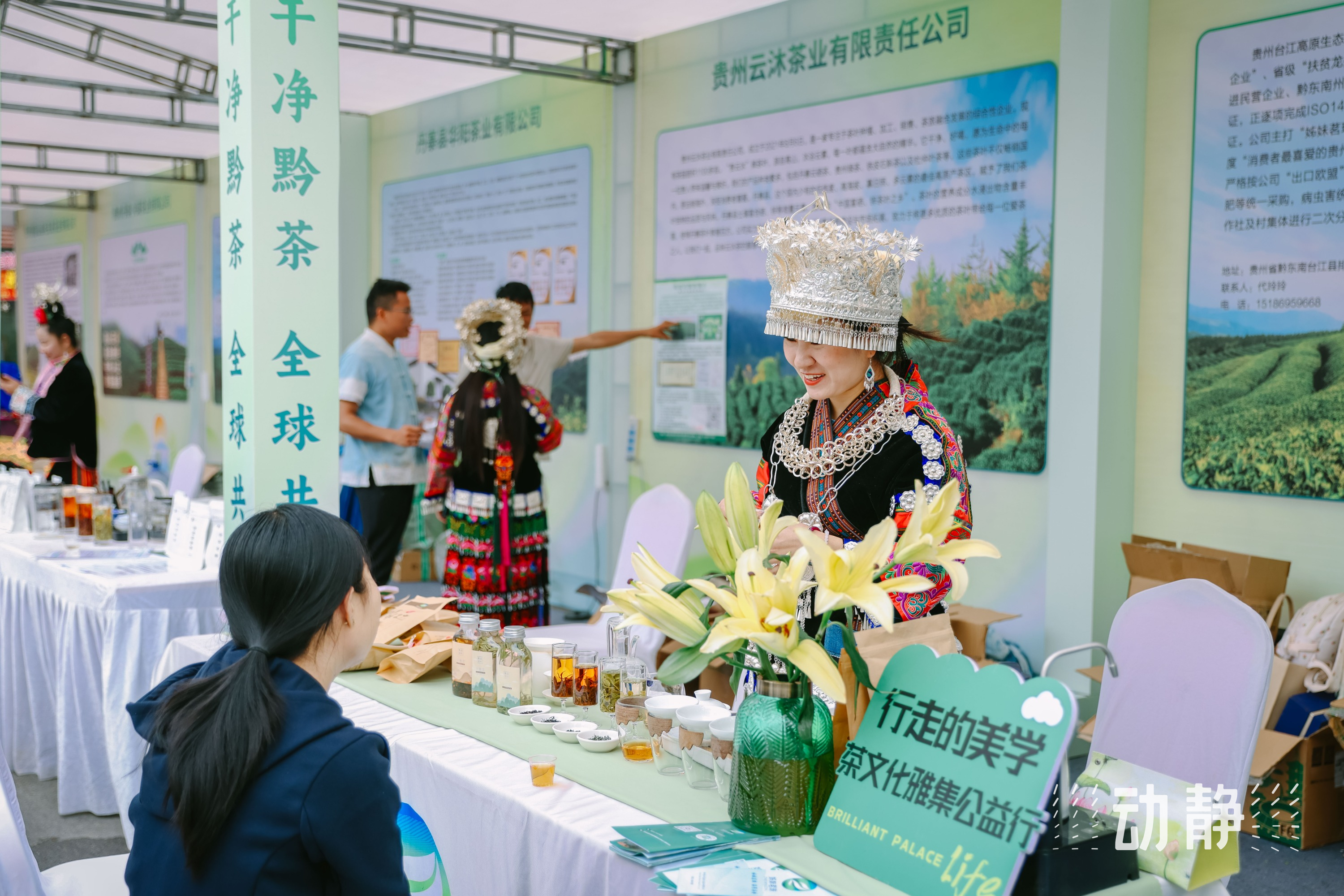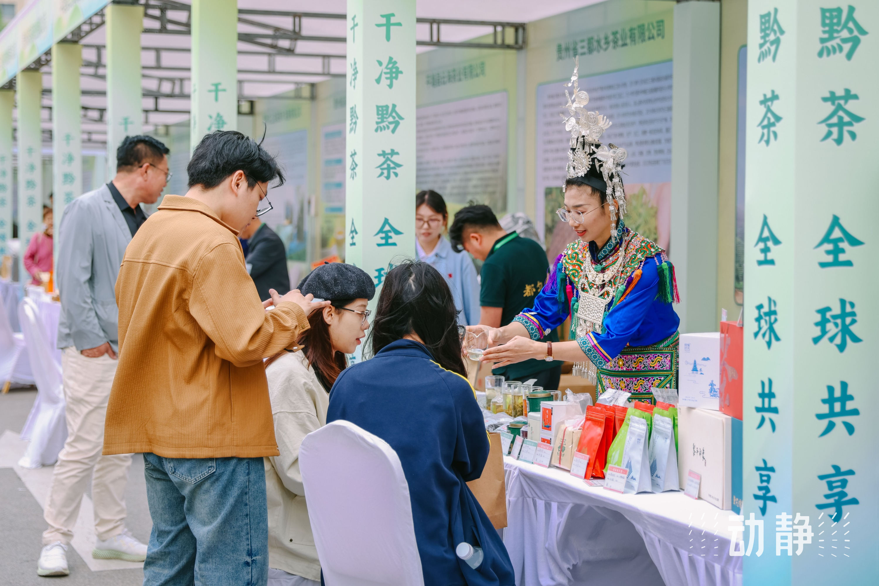 身着侗族服饰的茶艺师向参观者推介贵州茶