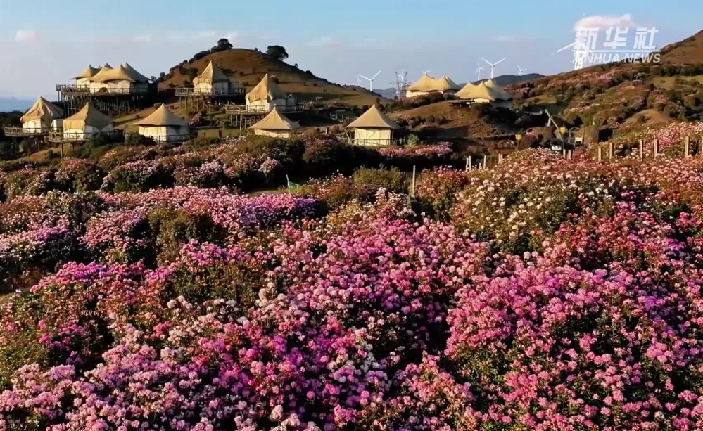 近日,贵州省盘州市乌蒙大草原万亩高原野生矮杜鹃全面进入盛花期。连绵起伏的山峦间,粉紫、粉红、白色的花朵与碧绿草甸、旋转风车、缥缈云海交相辉映,构成一幅壮美的高原春山画卷。