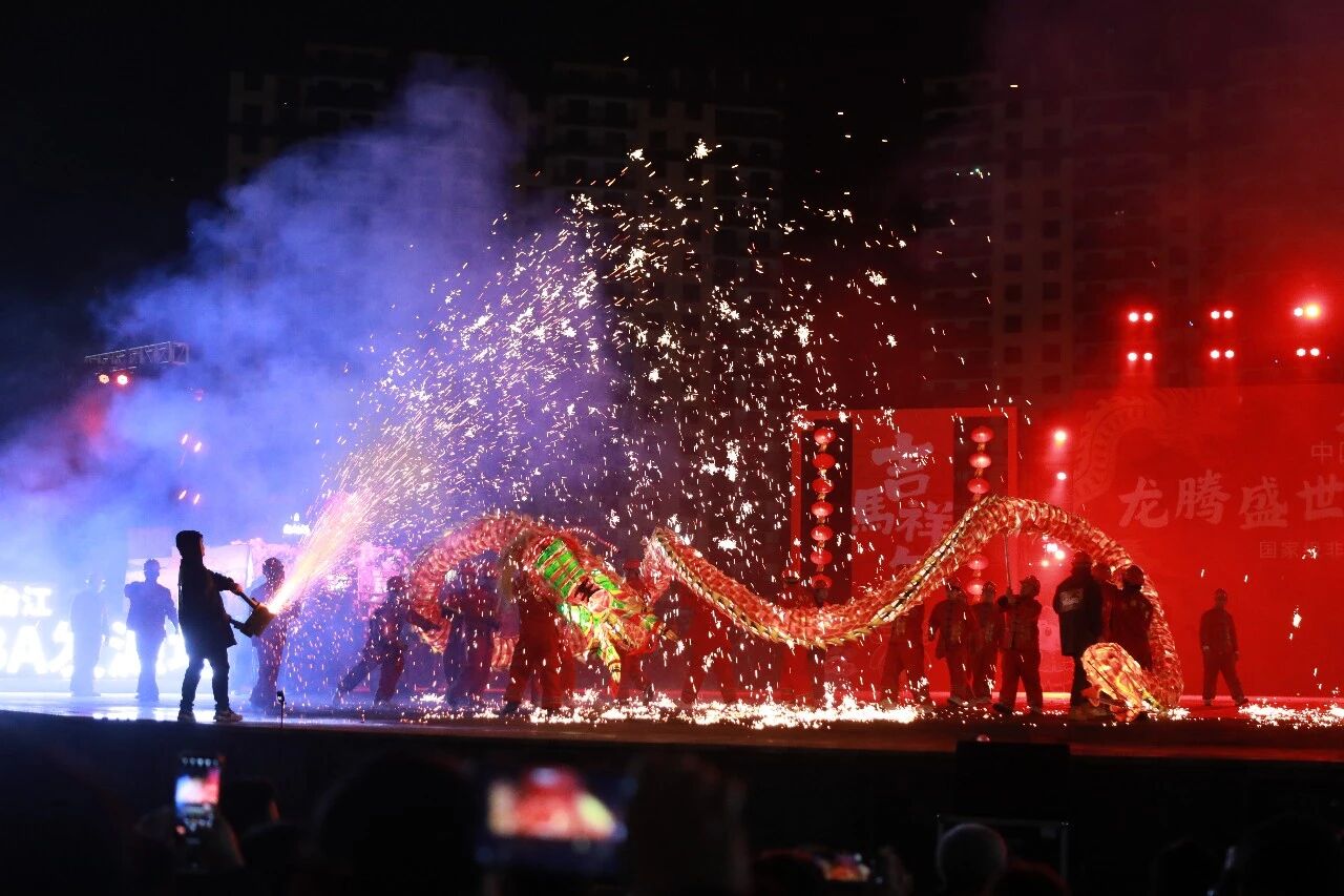 而在施秉县城,音乐喷泉广场灯火璀璨,全民狂欢的氛围被“龙舞八仙桌”和“嘘花炸龙”等特色民俗推向了高潮。亮龙、草把龙与主题花车在灯光下熠熠生辉,龙灯队伍在层层叠起的八仙桌上辗转腾挪、比拼技艺。群众手持嘘花筒,将焰火喷向舞动的龙灯,噼里啪啦的声响、绚烂的焰火与灵动的火龙交织,上演了一场火辣震撼的视觉盛宴,充分展现了民俗文化生生不息的活力。