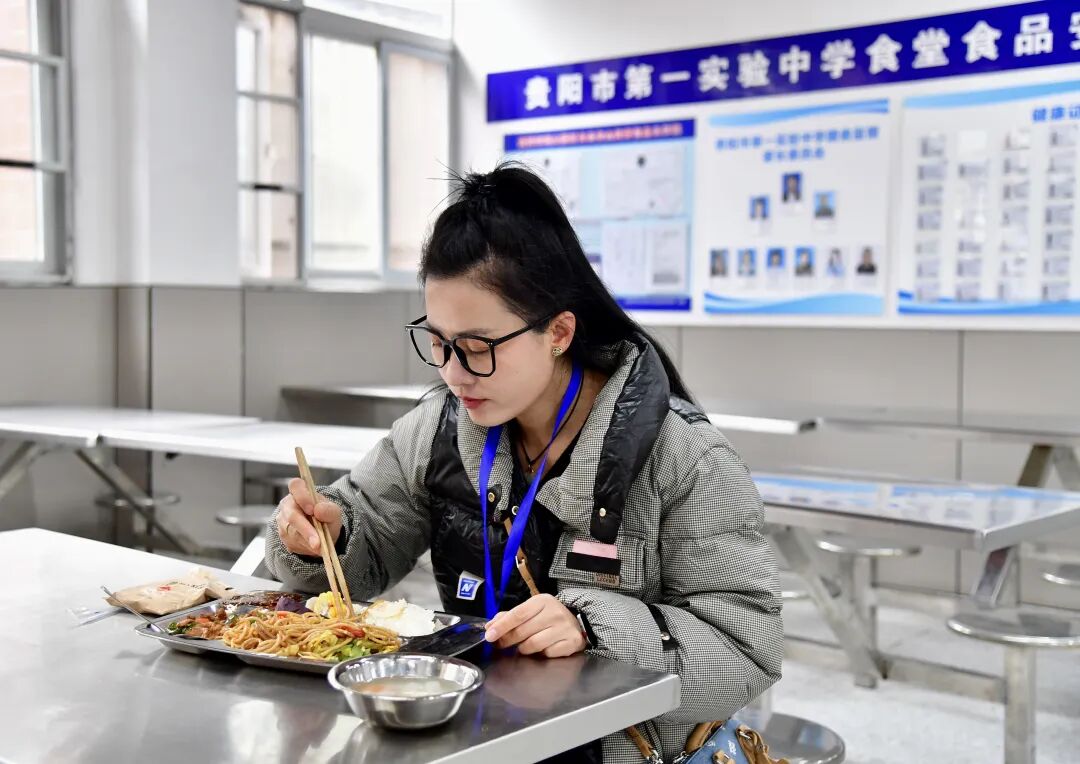 “我家有四个孩子,老大刚上七年级,小学时她们每天大概吃四道菜左右,上了初中后,她回家经常说在学校可以自由吃饺子、意面等,菜品很多每天就像吃自助餐一样。”贵阳市第一实验中学学生家长张惠兰说,“今天作为陪餐家长到学校食堂就餐,我觉得整个食堂看起来让我觉得很舒服,打饭的时候不论是饭菜还是饺子类都特别好吃,比我们家平常吃的都好。”抓好校园营养餐工作,任重而道远。观山湖区将持续通过“明厨亮灶”,抓好学校食堂全天候监管,继续联合市场监管部门不定期抽查供餐企业,切实把好源头关,督促学校从食材验收——加工——留样——用餐等环节全面把控“校园餐”食品安全,切实守护好学生“舌尖上的安全”。“我们将继续督促学校严格按照《观山湖区学校食品安全和膳食经费管理标准化实操手册》《观山湖区校园食堂标准化管理流程图集》规范操作,在全区学校‘厨神大赛’基础上,开展学生喜爱的菜谱评审活动,广泛收集学生偏好的食材和菜谱,进一步推动校园餐从‘吃饱’向‘吃好’转变。同时,邀请贵州省厨师协会为校园食堂提供专业指导,研发更多健康营养且符合学生口味的美食,不断丰富学生餐桌。”观山湖区教育局安全法规科负责人王明军说道。