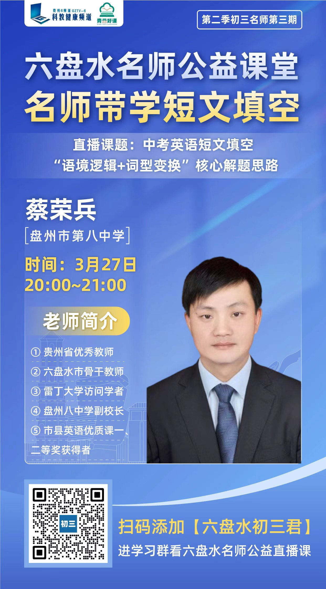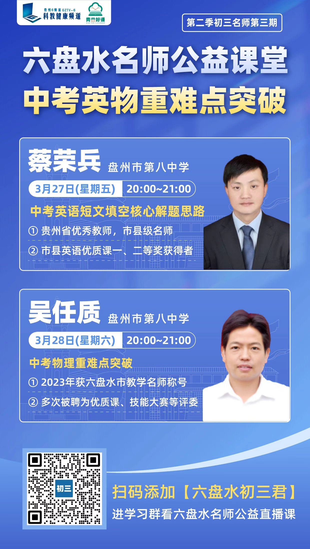 青云好课・六盘水市名师公益直播课堂第三期直播定于3月27日(周五)—3月28日(周六)晚间20:00-21:00开播,本周邀请盘州市第八中学副校长蔡荣兵老师和盘州市第八中学吴任质老师给大家带来中考英语、物理一轮备战复习课!