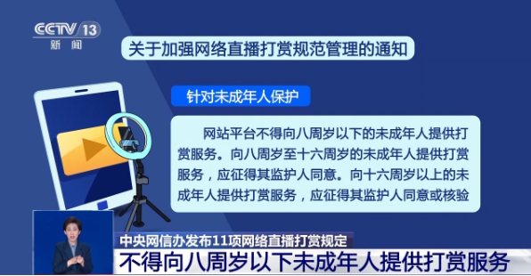 针对未成年人保护,“通知”要求,网站平台不得向八周岁以下的未成年人提供打赏服务。