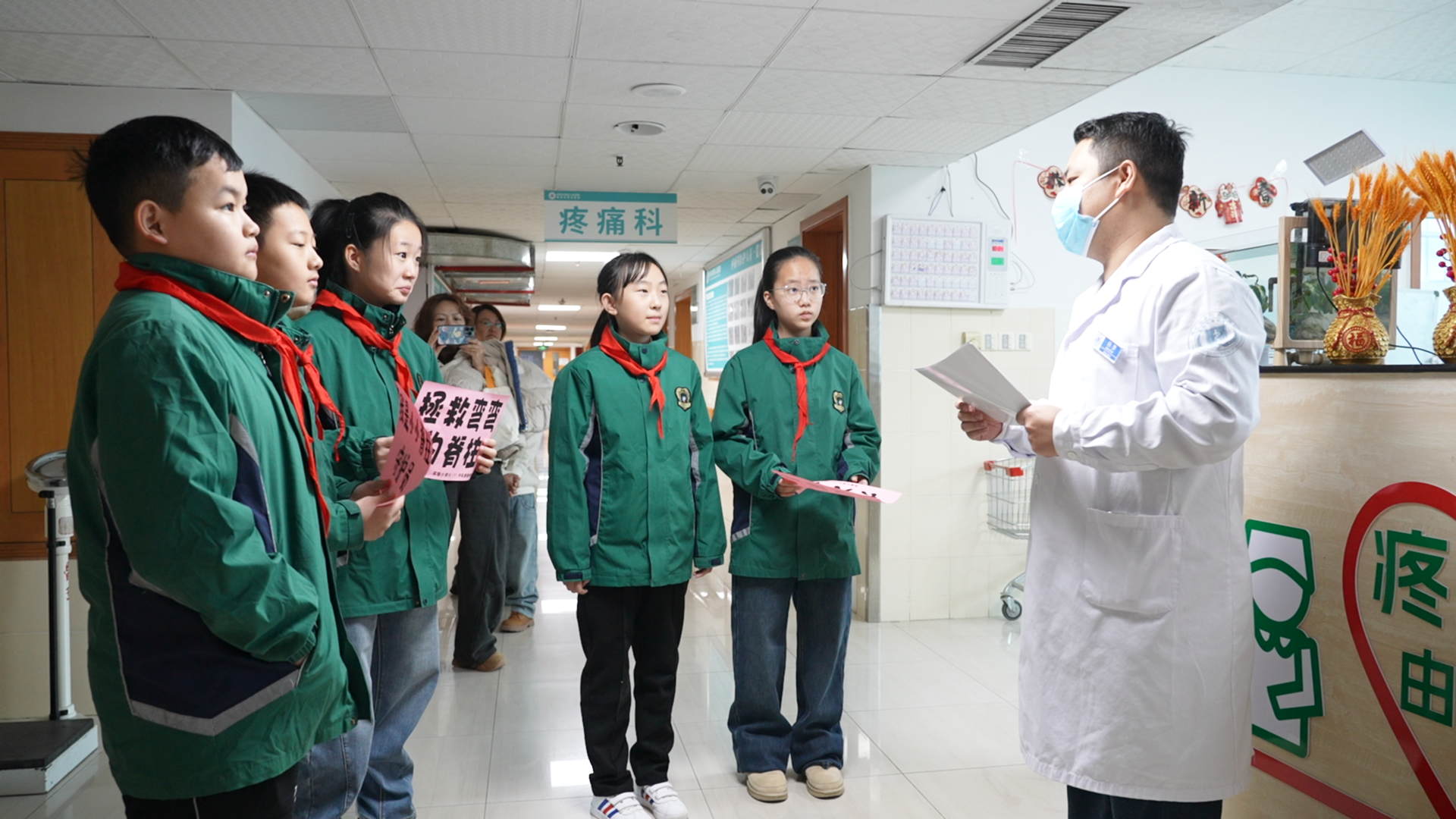随后,同学们分组参观了骨科康复治疗室,在医护人员的指导下,大家尝试了日常正确的坐姿和站姿,体验了简单的脊柱拉伸动作,部分同学还带着前期调研中收集的问题,向医护人员请教:“书包太重会影响脊柱吗?”“每天做哪些运动能保护脊柱?”专家耐心解答的同时,也鼓励大家将所学知识分享给家人和同学,成为脊柱健康的“小小宣传员”。