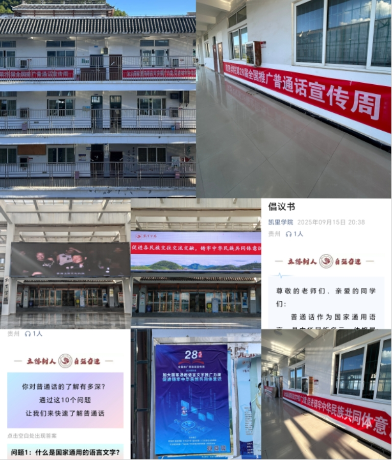 为加大国家通用语言文字推广力度,促进铸牢中华民族共同体意识,凯里学院于2025年9月15日至21日(第28届全国推普周期间)成功举办推广普通话宣传周系列活动。本次活动由教务处和校语言文字工作委员会牵头,各二级学院及相关部门协同配合,围绕“加大国家通用语言文字推广力度,促进铸牢中华民族共同体意识”主题,组织开展了形式多样、内容丰富的推广活动,营造了“说普通话、写规范字、做文明人”的浓厚氛围。