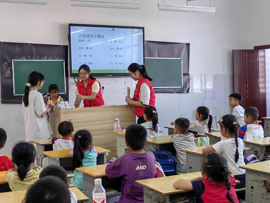 9月19日下午,旅游学院青年志愿者联合分会在罗琼老师和陆仙梅老师的带领下,组织7名志愿者赴铜鼓小学开展“推普进社区宣传”活动。志愿者们精心设计了四个特色互动环节:“词语填空小擂台”通过举手抢答方式帮助孩子们夯实词汇基础;“多音字拼音大挑战”让孩子们准确掌握多音字的不同发音与用法;“绕口令大比拼’锻炼孩子们的普通话发音流畅度;“民族文化朗诵会”用普通话演绎苗族、侗族传统民歌及谚语,实现语言学习与文化传承的双向融合。志愿者们分为教学组和秩序维护组,通过“答题奖励”机制充分调动孩子们的积极性,课堂上踊跃举手、积极互动的场景成为常态。