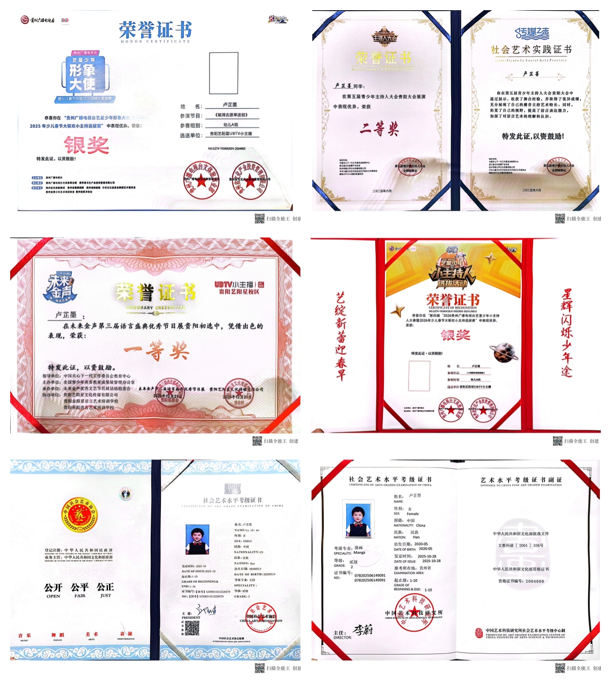 1.贵州广播电视台艺星少年形象大使选拔赛暨2025年少儿春节大联欢小主持选拔赛银奖;