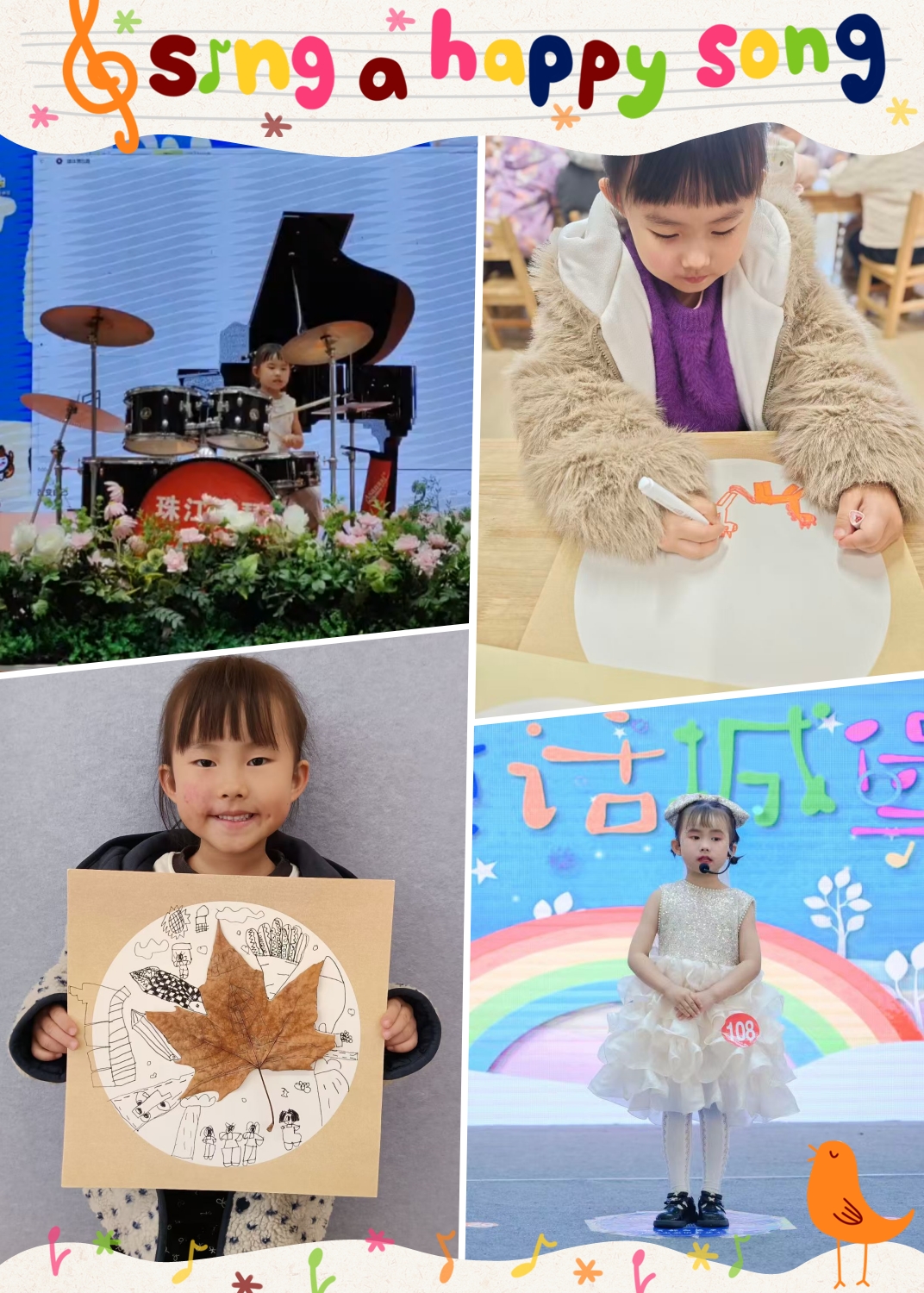 这就是我——一个用画笔描绘幻想、用声音分享故事、用鼓点释放活力的小女孩。妈妈说我是“静如处子,动如脱兔”,我觉得特别形象!一路走来,我也得到了一些小小的鼓励:
