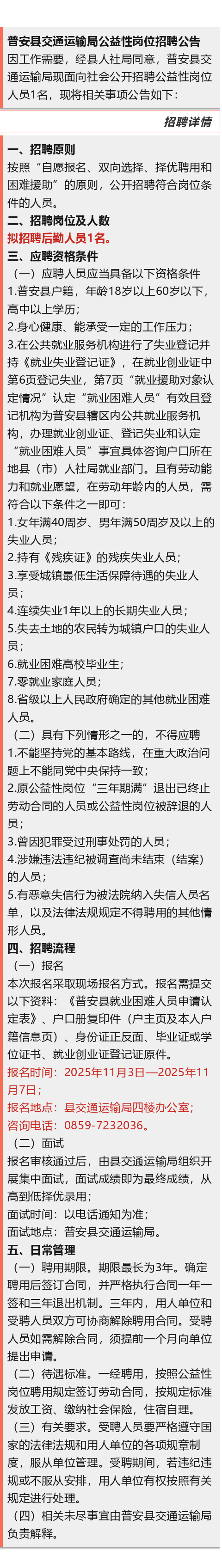 【政府机关】普安县交通运输局招聘后勤人员!60周岁以下可报!