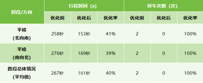 优化后,乌江路往王宽路(北往南)的行程时间减少为153秒,对比优化前的258秒,下降了41%;停车次数降为0次。