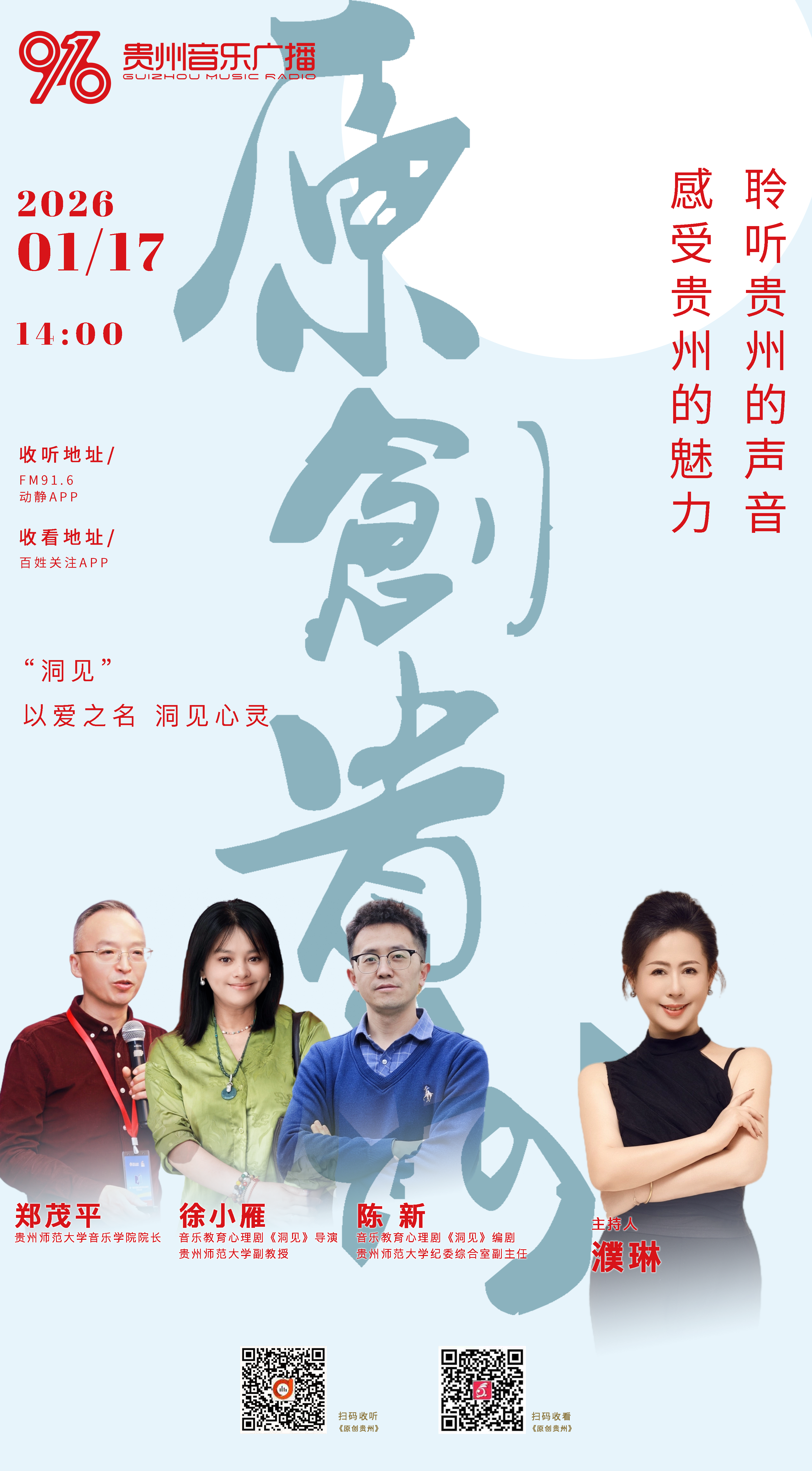 FM91.6贵州音乐广播1月17日14:00原创贵州·对话|贵州师范大学音乐学院院长郑茂平、贵州师范大学副教授、音乐教育心理剧《洞见》导演徐小雁、贵州师范大学纪委综合室副主任、音乐教育心理剧《洞见》编剧陈新,“洞见”以爱之名,洞见心灵。