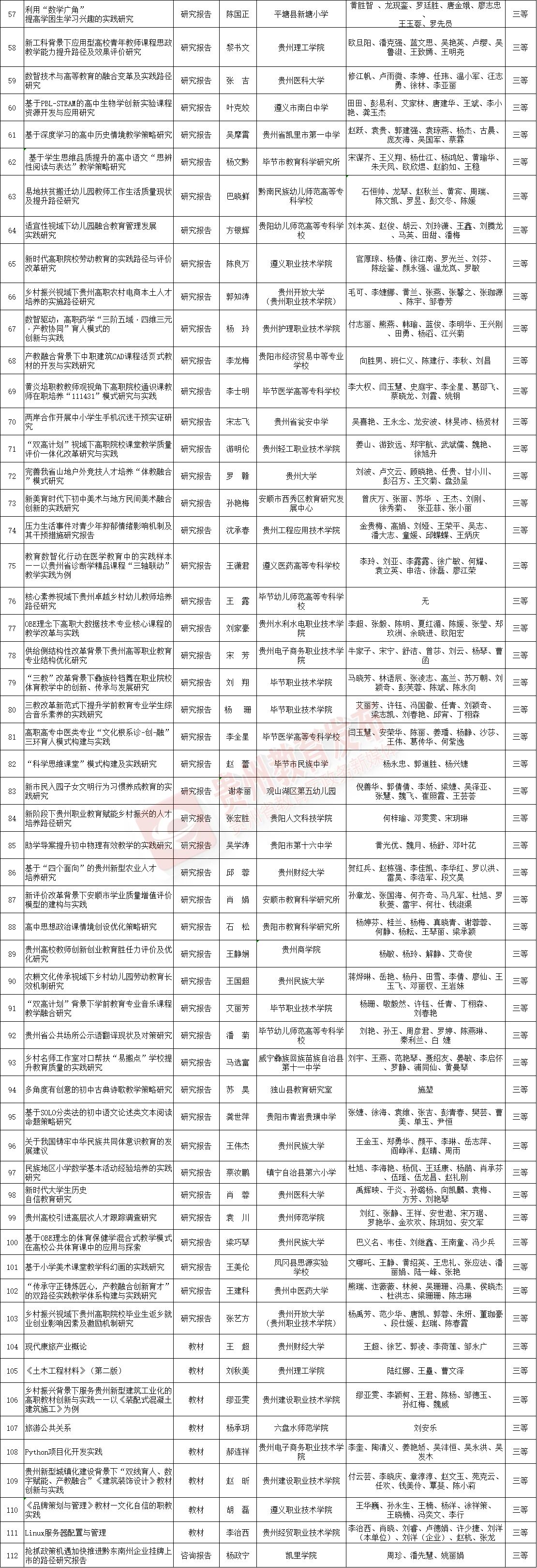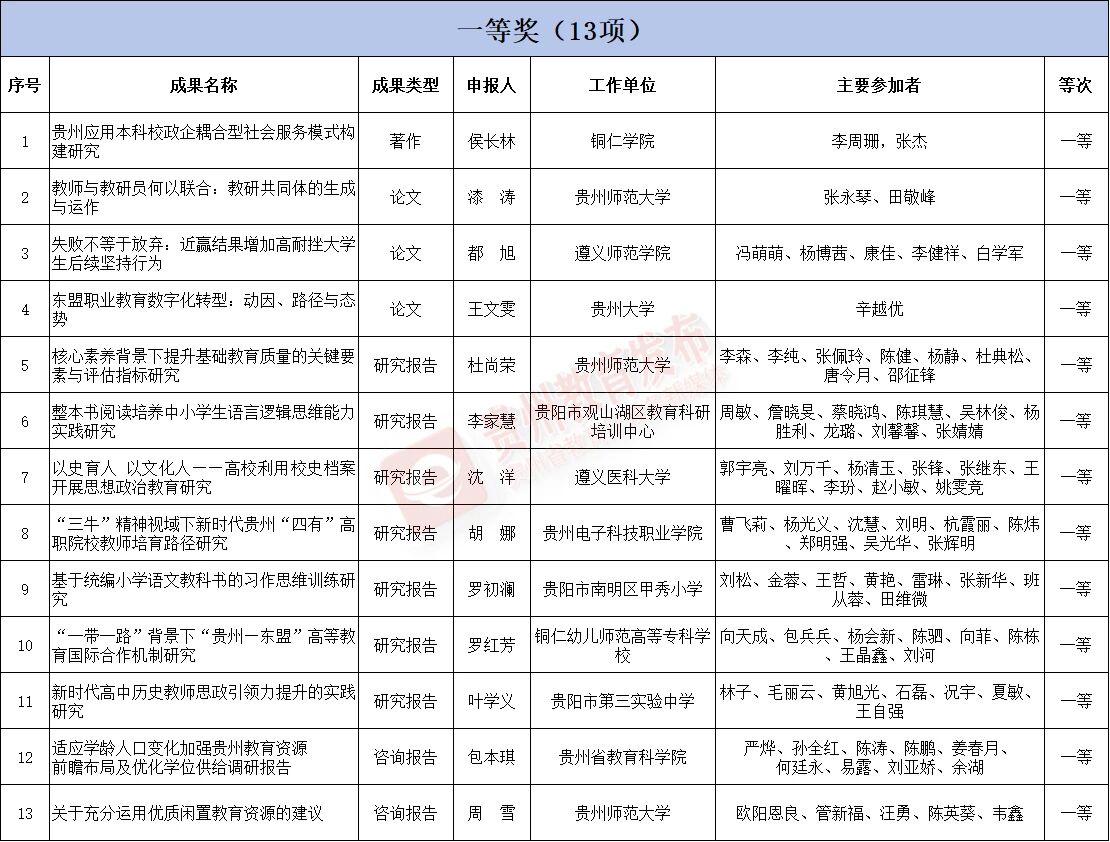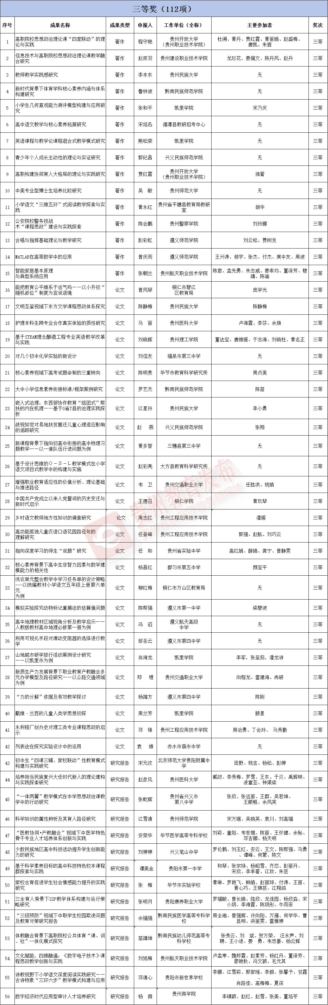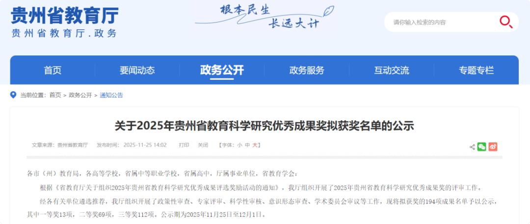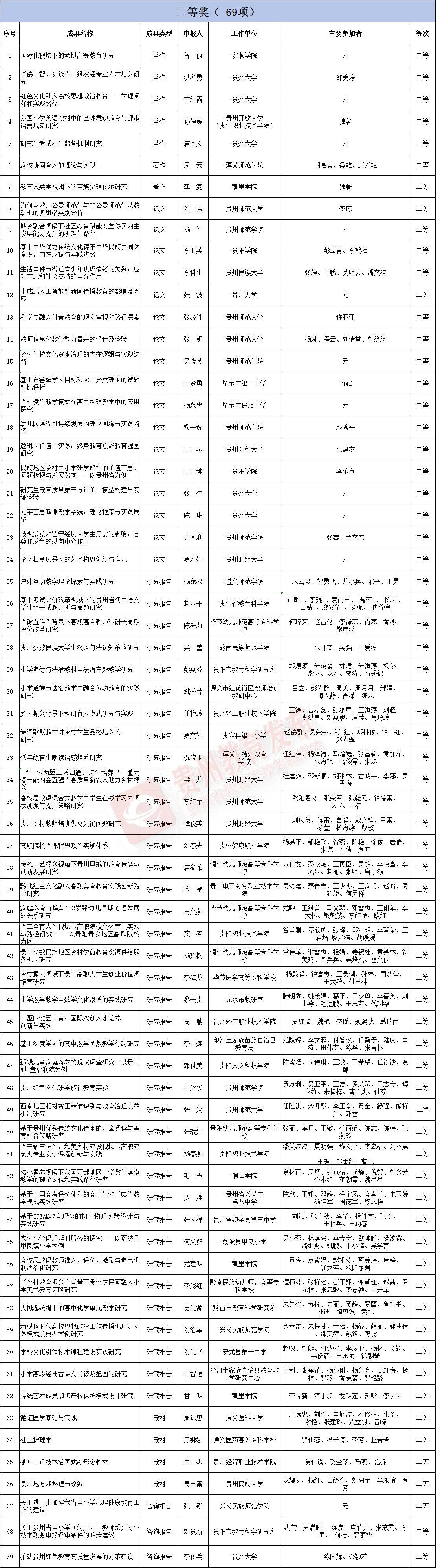 近日,2025年贵州省教育科学研究优秀成果奖的评审工作已完成,经各有关单位遴选推荐,省教育厅组织开展政策性审查、专家评审、科学性审核、意识形态审查、学术委员会审议等工作,现将拟获奖的194项成果名单予以公示,其中一等奖13项,二等奖69项,三等奖112项。公示期为2025年11月25日至12月1日。一起来看——