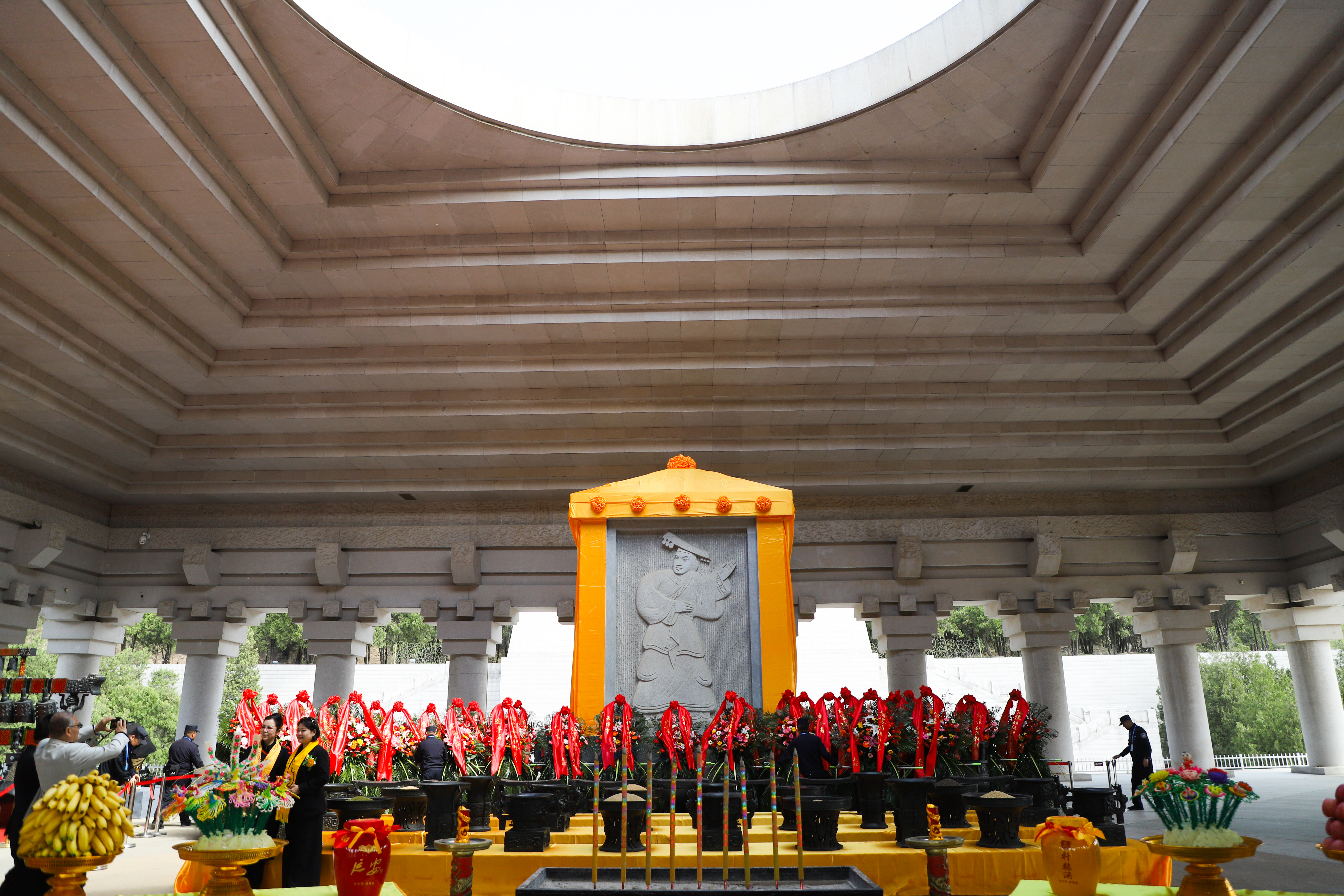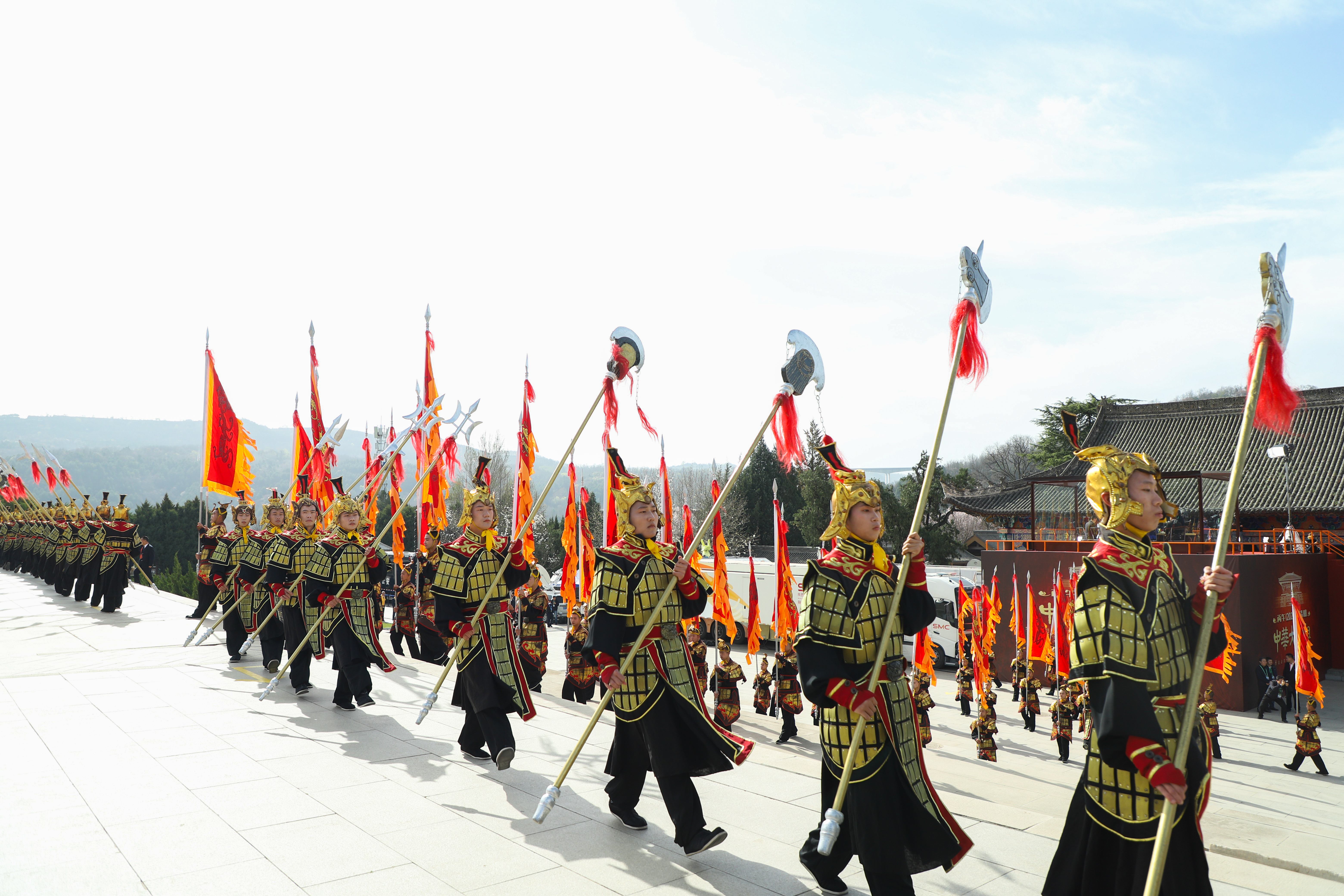 典礼现场陈设尽显中华礼乐文明精髓。轩辕殿祭祀广场东西两侧,九尊青铜牛鼎与八尊铜簋静静肃立,构成“九鼎八簋”的最高规格阵列。此制可追溯至西周,天子享九鼎八簋,代表至高权力与对始祖的极致尊崇。这些曾作为国家象征的“重器”,此刻化为凝固的礼乐,无声述说着中华文明源远流长的历史与一脉相承的道统。