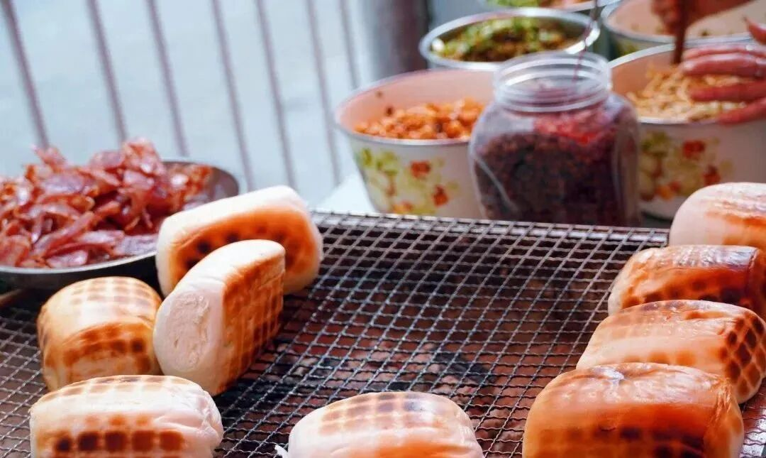 烤馒头是贵阳特色小吃之一,将馒头放在炭火上烤至两面金黄,再从中间横向切开,加入折耳根、海带丝、酸萝卜、酸豇豆、花生米,这是素食版,土豪版还可以加香肠、腊肉等,因此烤馒头还被称为“贵州汉堡”。它是寒冬手里捧着的“暖手宝”,更是刻进贵州人记忆里的冬日符号。