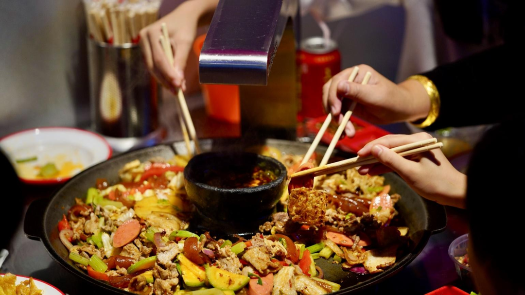 冬日的贵州街头最热闹的莫过于烙锅摊,圆形铁锅架在炭火上,猪油刷开的瞬间香气飘了出来。三五好友凑在一起,点上五花肉、鸡翅尖、臭豆腐、小瓜片,看着食材在锅里慢慢煎出油脂,外皮焦脆的声响格外治愈。蘸上本地特调麻辣蘸水,就着温热米酒或冰镇啤酒,是冬天最惬意的打开方式。