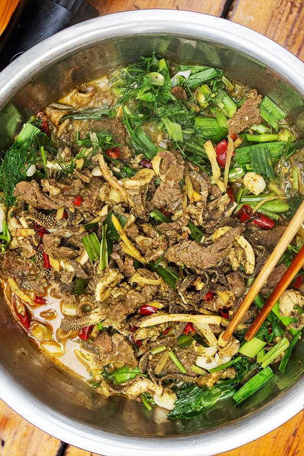 虾酸火锅,是贵州火锅届的“螺蛳粉”。虾酸选用当地新鲜小河虾,经过多道工序腌制发酵而成,味道奇臭浓郁。虾酸火锅最好的搭档是炒牛肉和牛板筋,再撒上薄荷叶,虾酸的臭味、辣椒和牛肉的香味,薄荷的清凉,在口腔中相互碰撞,幻化成一口鲜香,便是幸福的味道。