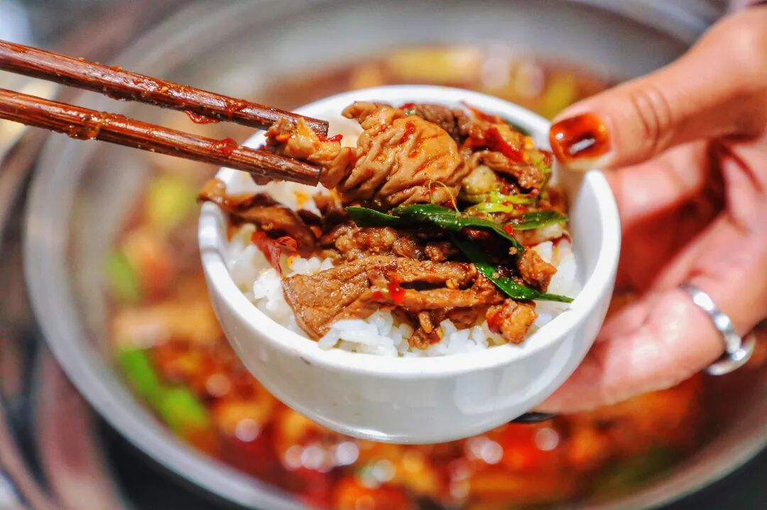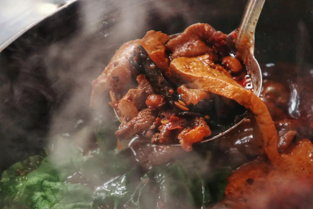 地摊火锅兴起于贵州农村赶集,一个煤炉、一口铁锅、几张木条凳,就像摆地摊一样,所以叫地摊火锅。特色在于锅底现炒,猪肉现称现切。肥肉拿来熬油,炒锅底,辣椒融入豆豉,汤底越煮越有味道,吃完配菜再用汤汁泡米饭,是贵州人唇齿之间不可割舍的味道。