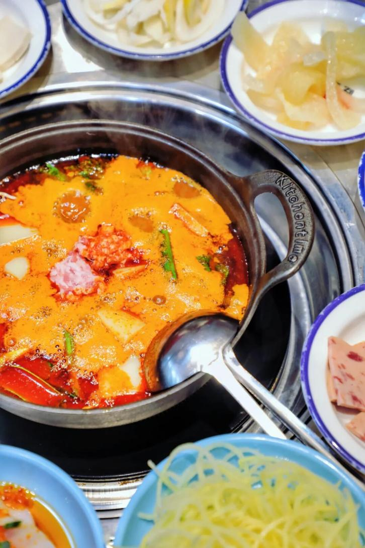 夺夺粉起源于上世纪九十年代初贵州安顺七小门,最开始其实是一种街边小吃,各种东西煮上一小锅,大家用竹签“夺”着吃;还有一种说法是,由于量少,大家都“争夺”着吃。夺夺粉火锅的锅底酸汤是用土陶坛发酵而成,微微辣,加入肉末、软哨,再配上蔬菜超级入味,酸汤伴着米饭,可以吃三大碗。