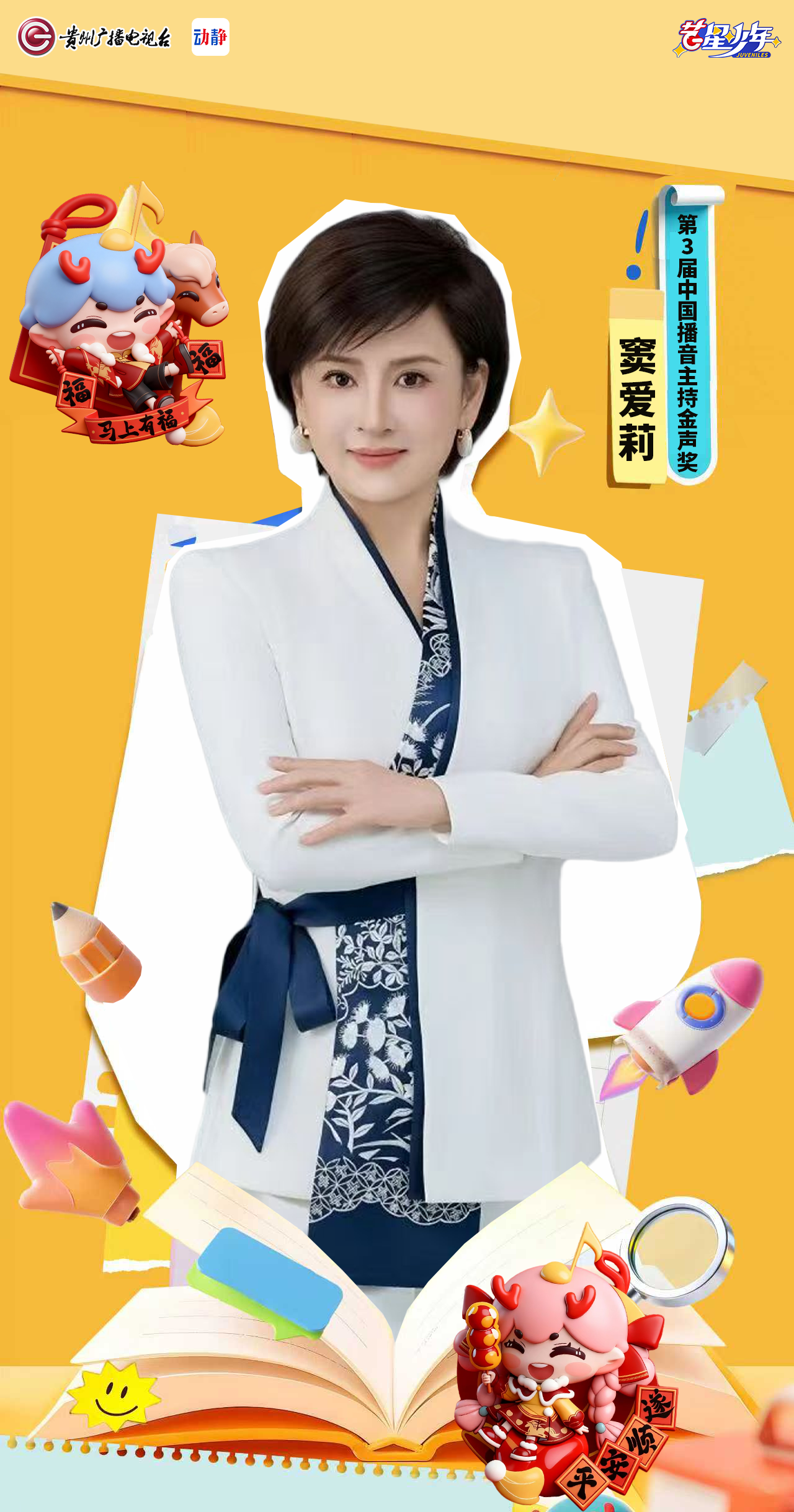 三十年前,一次“无知者无畏”的海选,让窦爱莉叩开了播音事业的大门;2001年起,在《贵州新闻联播》主播台日复一日的坚守,到2007年《论道》节目中的参与者;从2018年央视春晚贵州分会场让家乡被世界看见的使者角色,到2022年在贵州省道德模范表彰现场传颂时代精神的传颂者身份……多年来,她深耕少儿语言艺术与美育推广领域,作为“艺星少年”品牌的温暖陪伴者,始终关注少年儿童的表达成长与梦想发光。