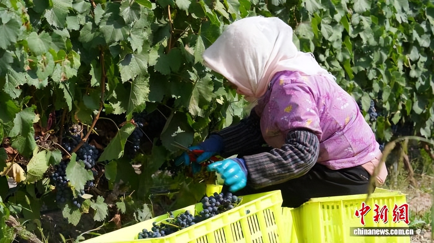农户采摘成熟的酿酒葡萄。(资料图) 宁夏贺兰山东麓葡萄酒产业园区管委会供图