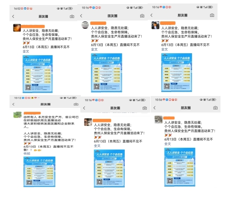 6月10日,该公司员工还充分利用社交平台的传播速度快、覆盖面广的优势,通过朋友圈推送安全知识课程观看指引,邀请朋友圈的客户及亲朋好友观看贵州人保安全生产月直播,让更多人足不出户就能够便捷获取专业、实用的安全知识内容。