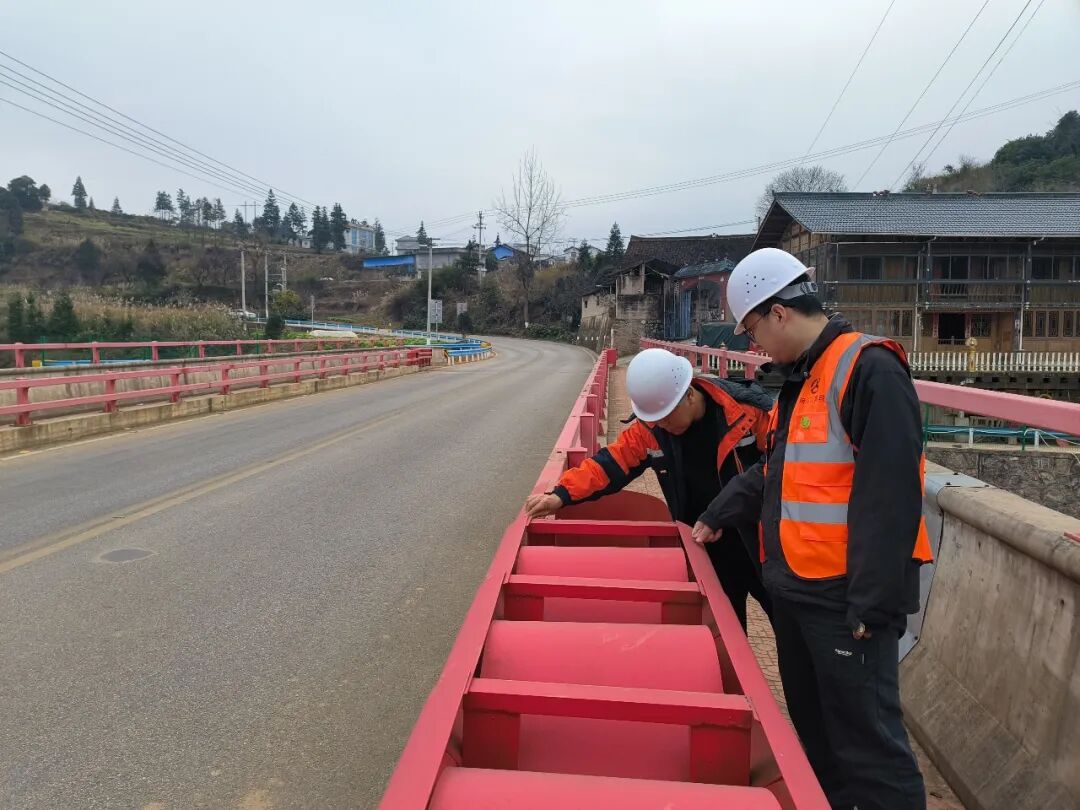 工作人员在S311线打铁寨桥检查交安设施