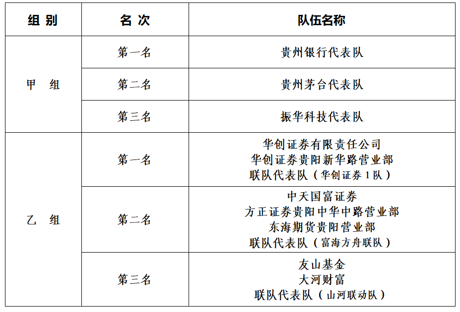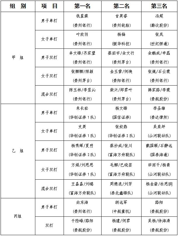 比赛现场气氛热烈,运动员们激情四射、斗志昂扬。精准的发球、灵活的扑救、有力的扣杀......赢得观众阵阵喝彩,球场上的欢呼声、加油声此起彼伏,充分展现了贵州资本市场人的活力与激情。裁判团队严谨公正,工作人员恪尽职守,赛事组织井然有序。经过两天激烈角逐,贵州银行代表队、华创证券1队分别摘得甲、乙组团体桂冠;贵州银行和贵州茅台代表队分别拿下甲组五个单项冠军;华创证券1队、华创证券2队、富海方舟联队分别荣获乙组五个单项冠军;贵州银行、贵航股份分别问鼎丙组男子单打、双打冠军