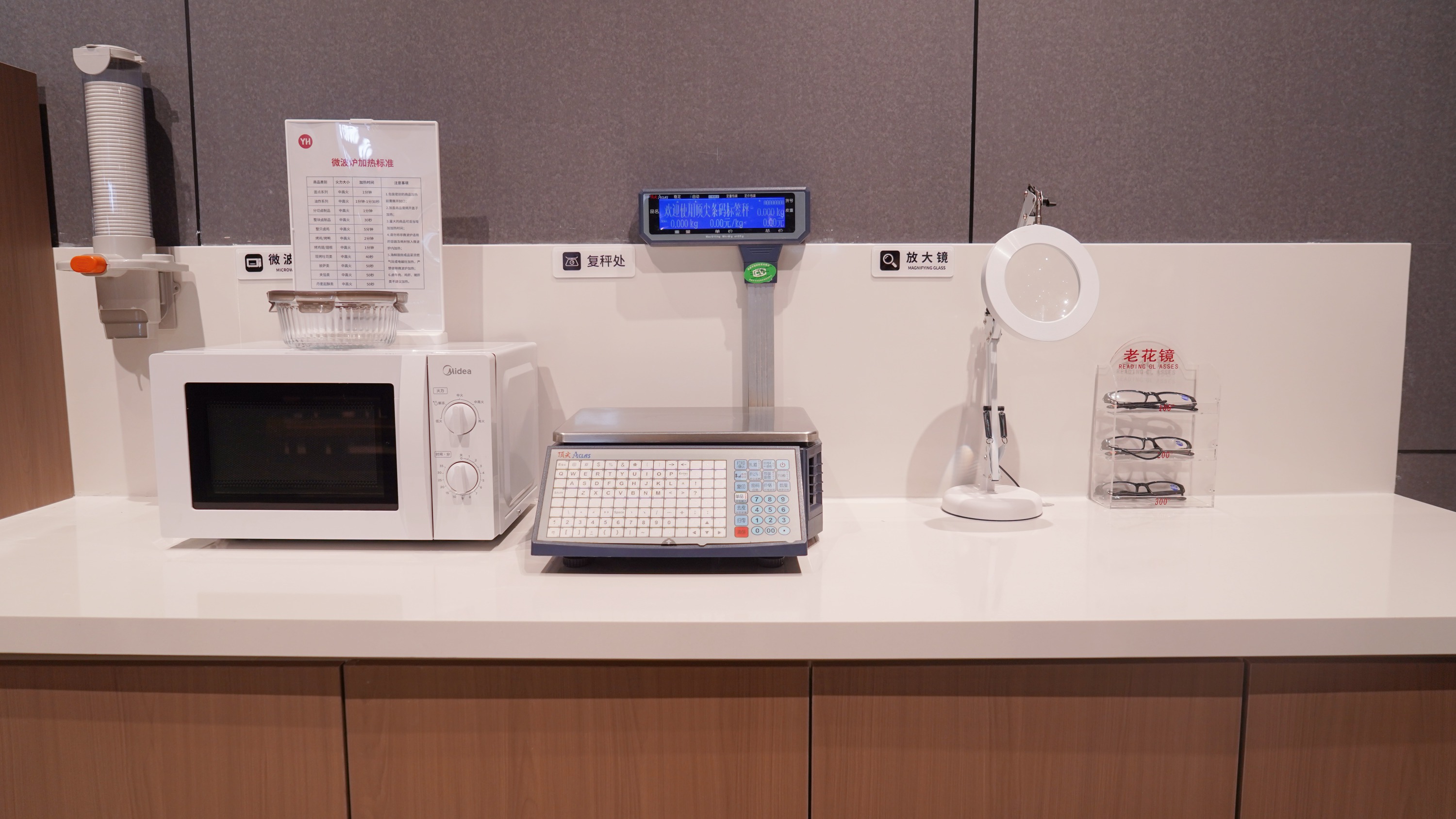 服务提升是此次调改的另一大亮点。门店设立了功能丰富的顾客休息区,提供一次性餐具、身高血压视力测量设备、医疗箱、爱心糖果、爱心轮椅,以及自助取冰、直饮水、微波炉等便民设施,并贴心设置了宠物寄存处与宠物直饮水。