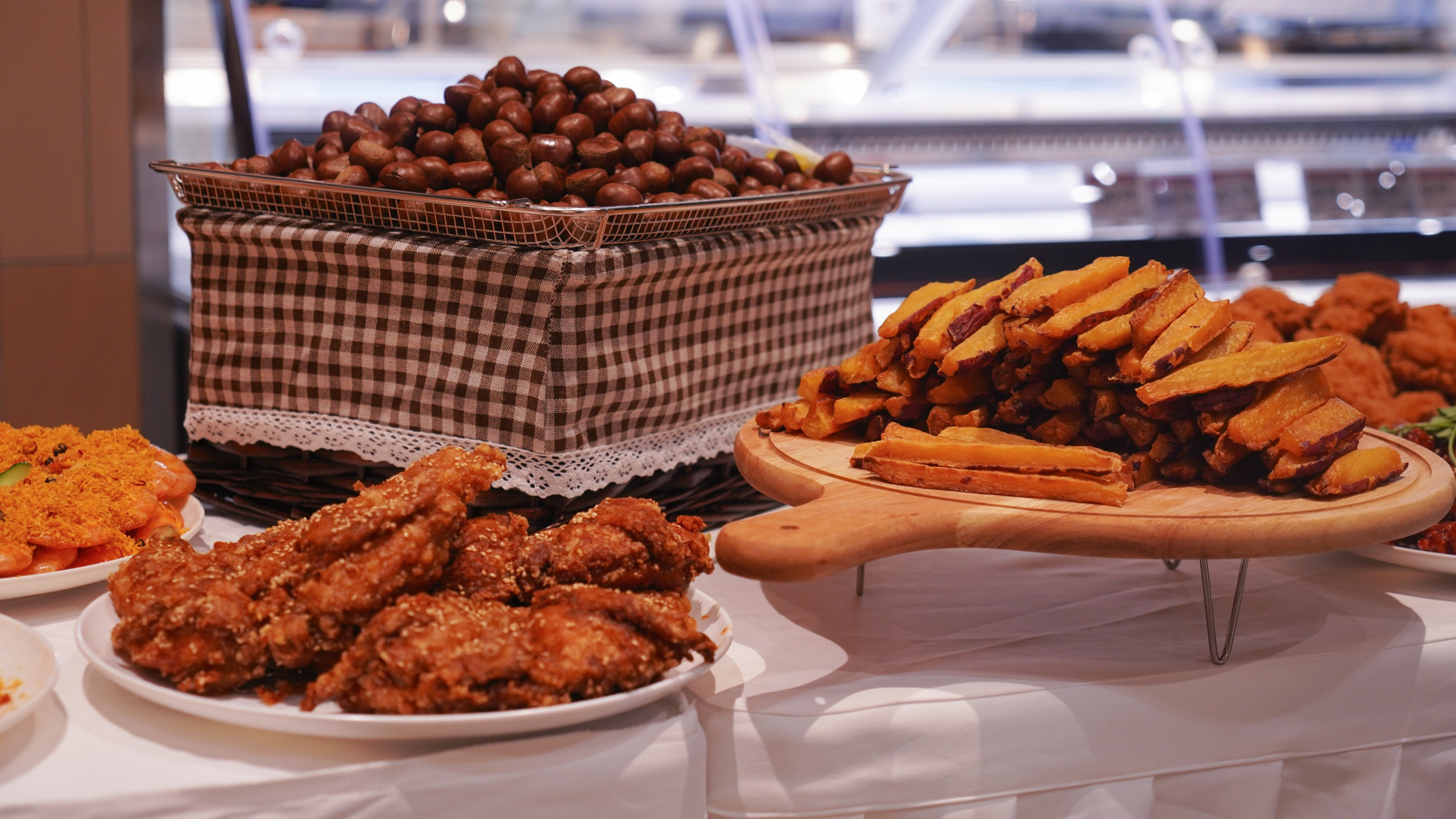为增强卖场“烟火气”,熟食与烘焙区域得到了重点强化。熟食板块新增日邦寿司、双汇热卤、九多肉多、猪坚强等品牌,商品支数达到360支。其中,网红商品“小甜肠”以其外酥里嫩、爆汁口感及多种烹饪适应性受到关注;“国潮炸鸡”强调现制现售与8小时腌制,主打外酥里嫩。此外,顾客还能在此买到胖东来同款的香辣猪蹄、秘卤肉肠及韩式炸鸡。