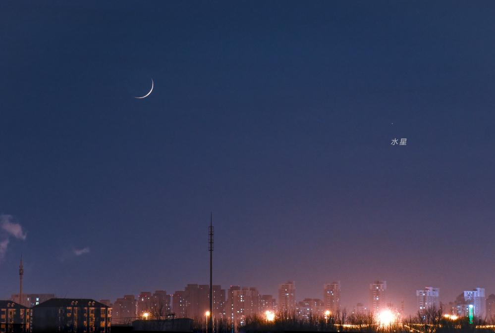 2022年1月7日水星东大距。这是在东大距前夕的1月4日于天津拍摄的水星与蛾眉月。(杨婧 摄)