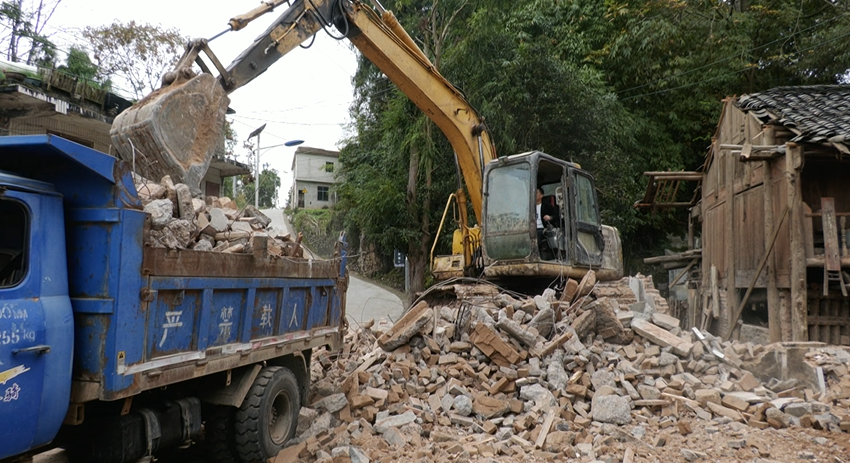 在国荣乡楼上村清理现场,挖掘机轰隆作响,铁臂挥动间,一栋废弃危房正被有序拆除。而在甘溪乡晒溪村、扶堰村,拆除现场同样热火朝天,村民们手持大锤、铁锹合力攻坚,分工协作,一场残垣断壁的拆除行动正在有序进行。