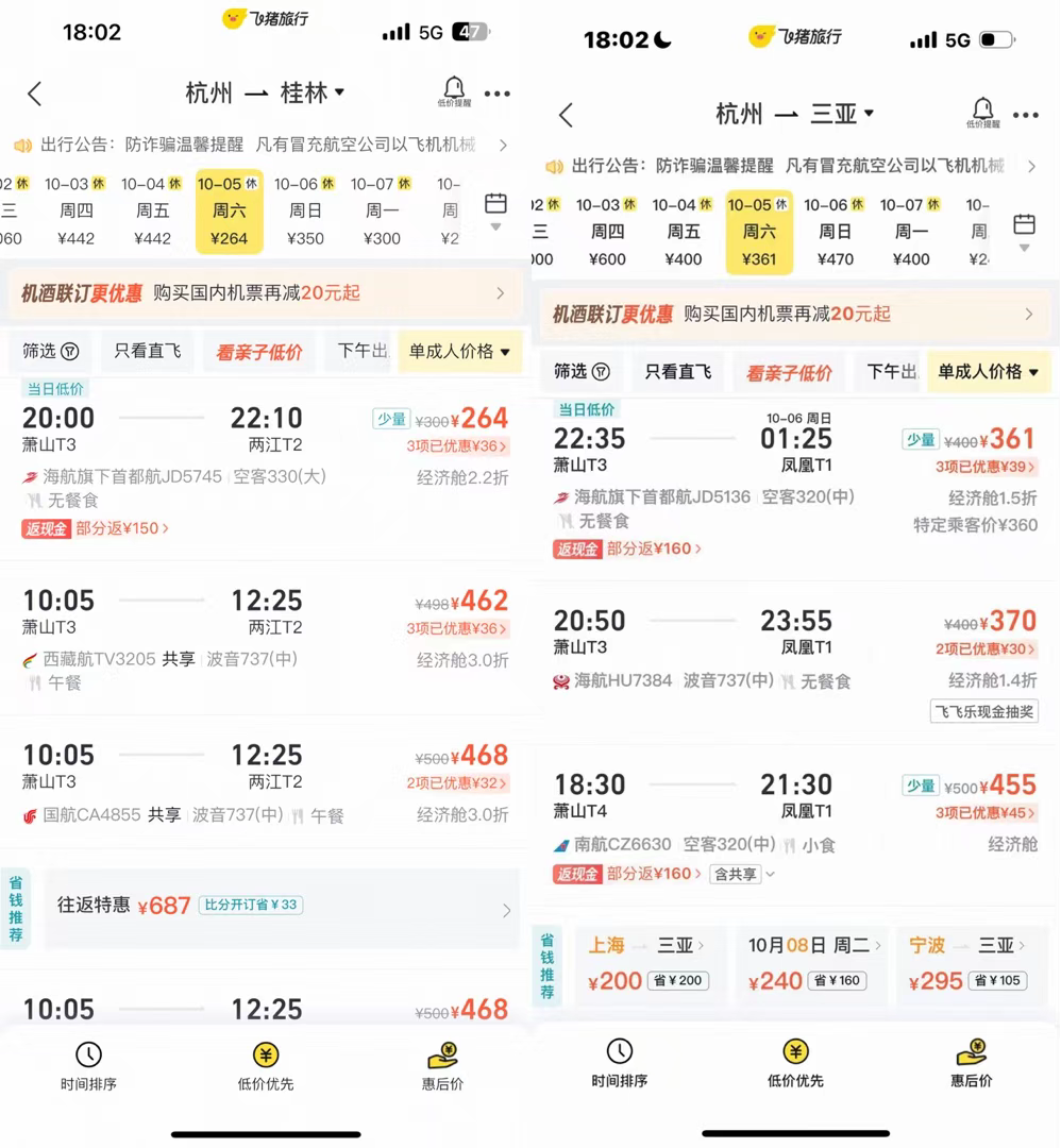 多方数据显示,今年十一出行的机票、酒店价格比去年更有竞争力。记者搜索出行平台App发现,以杭州为出发地,10月5日飞往三亚的实时机票最低价格仅为361元,飞往桂林的实时机票最低价格仅为264元。叠加燃油附加费下调,错峰出行更划算了。(记者 张越熙)