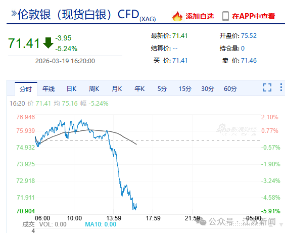 19日午后,白银急跌,截至发稿,现货白银跌超5%,跌破72美元/盎司。