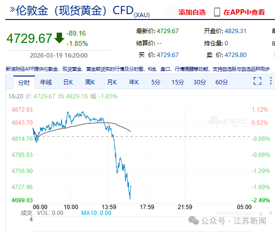 19日,现货黄金持续下挫,跌破4800美元关口。截至发稿报4729.67美元/盎司,跌1.85%。