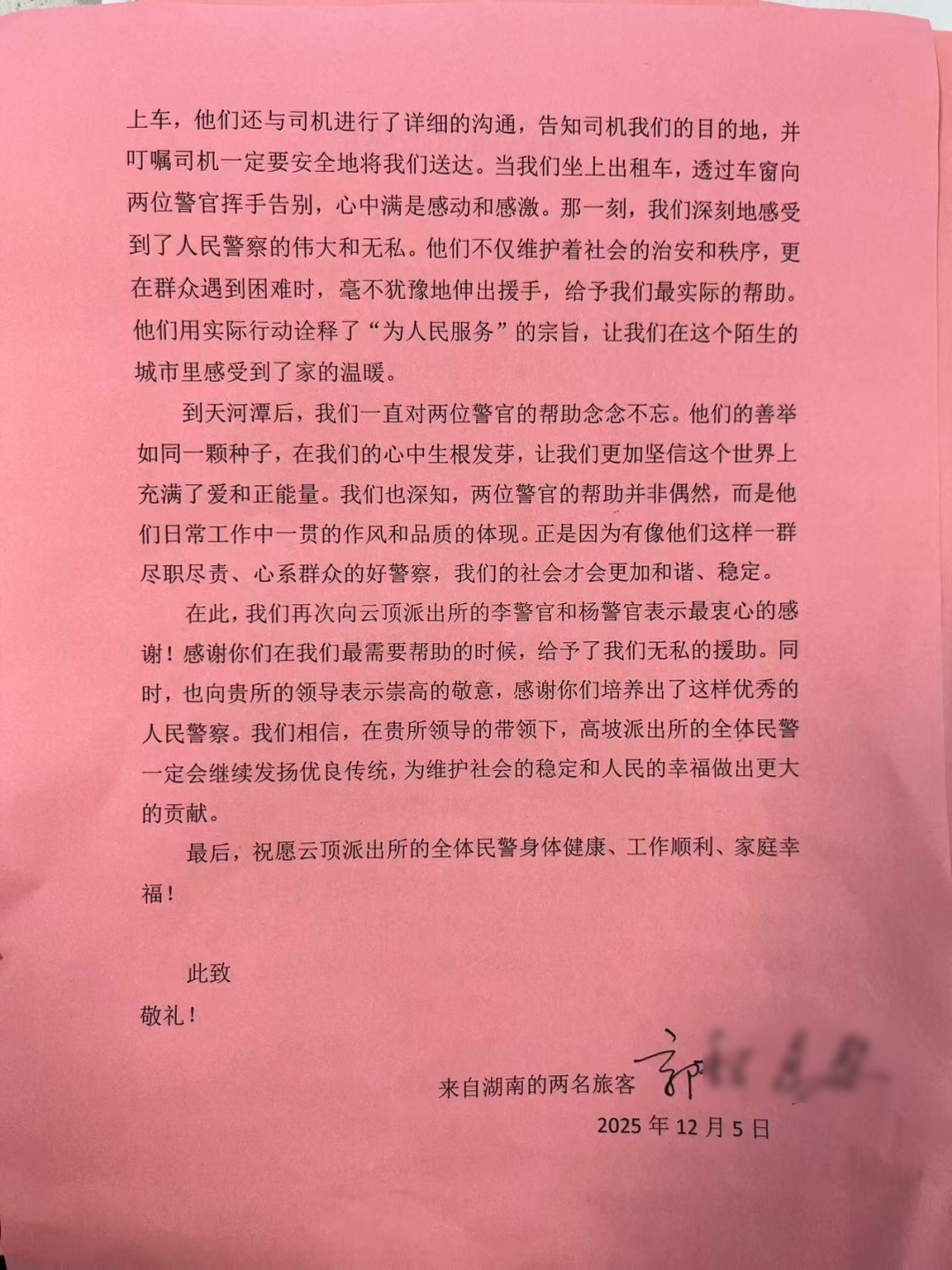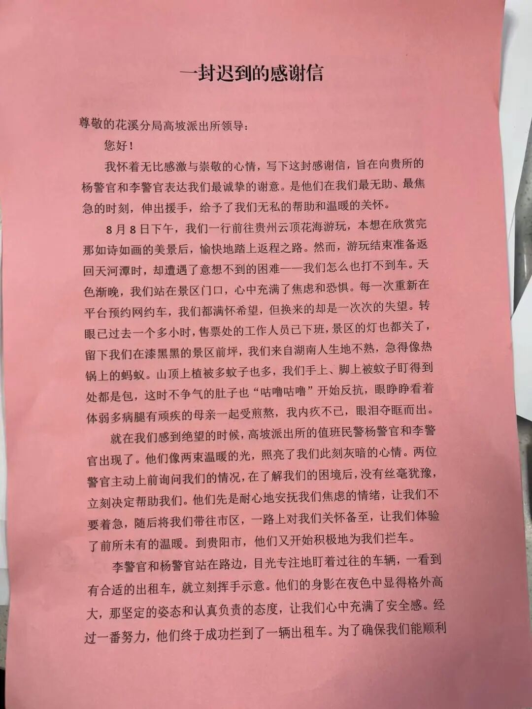 信中以平实的语句表达了对花溪公安民辅警工作态度的认可,字里行间也蕴含着深深的警民羁绊。