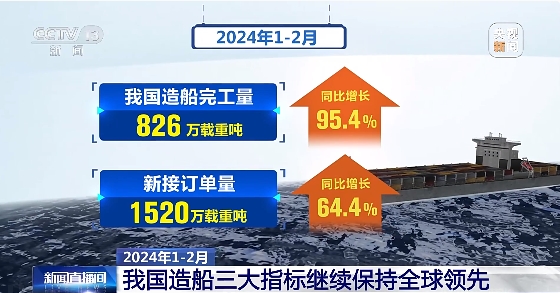 最新数据显示,2024年1—2月,我国造船完工量826万载重吨,同比增长95.4%;新接订单量1520万载重吨,同比增长64.4%;截至2月底,手持订单量14919万载重吨,同比增长31.3%,造船三大指标国际市场份额继续全球领先。