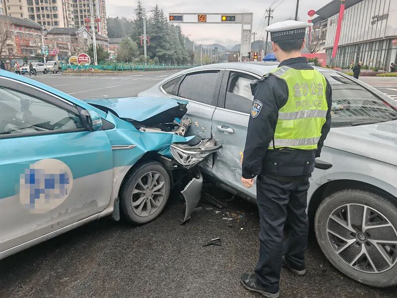 近日,金沙县公安局交通管理大队接到报警称:辖区泰山路枫格语林红绿灯路处,一私家车与出租车发生碰撞,请求立即出警,接到报案后执勤人员迅速赶赴现场进行处置。