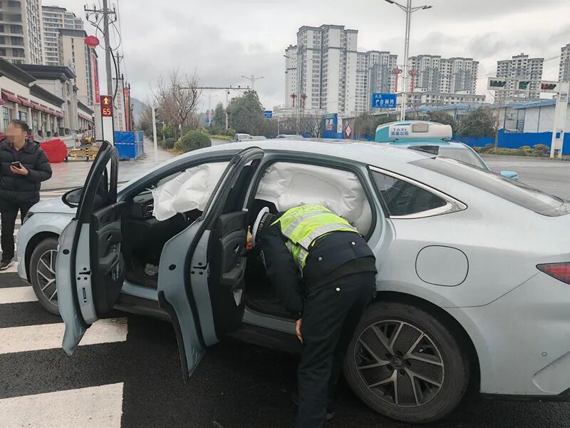 到达现场后,只见两辆碰撞车辆停在红绿灯十字路口处,两车首尾相撞,车辆零件散落一地,所幸,两车驾驶人均系了安全带,事故并未造成人员受伤。