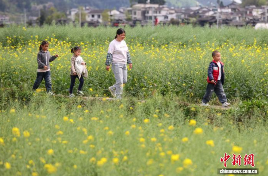 图为学生和家长在贵州省贵定县金海雪山景区油菜花田徒步。记者 瞿宏伦 摄