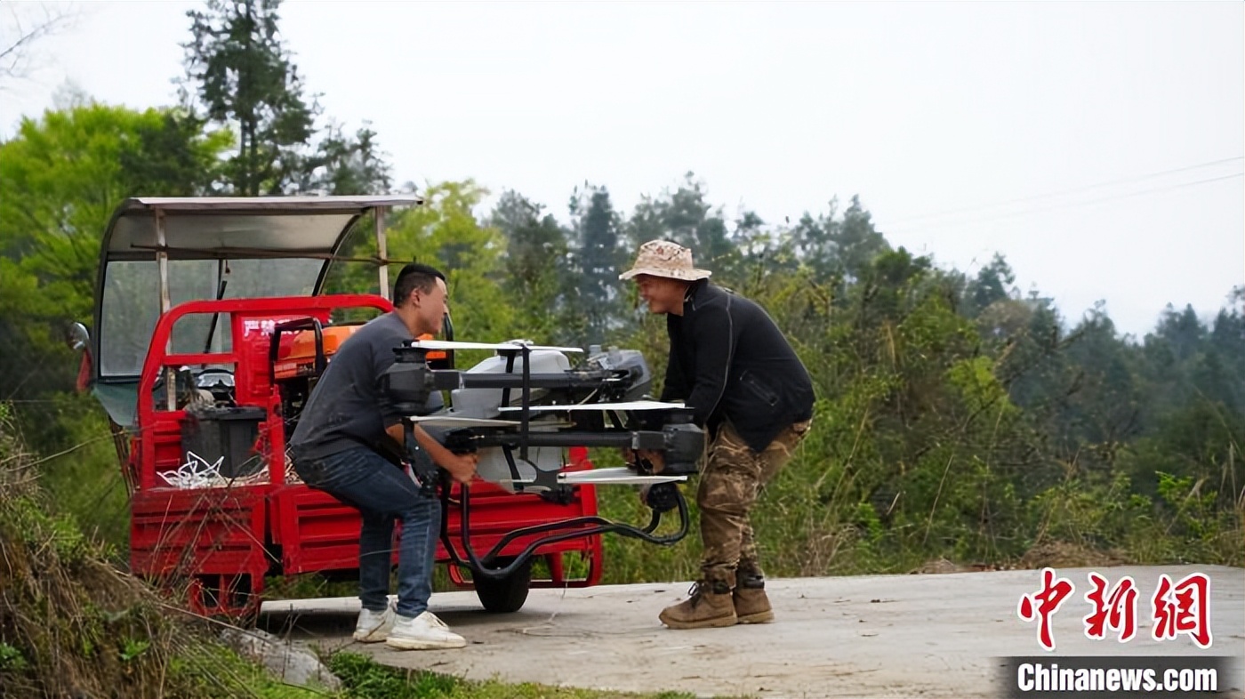 “小何,西南角补两袋有机肥。”胡天云对着对讲机喊话声刚落,远处山腰便腾起一架植保无人机,年轻“飞手”操控着载重40公斤的无人机精准投送春肥。15亩坡耕地,无人机很快将肥料投送完毕。