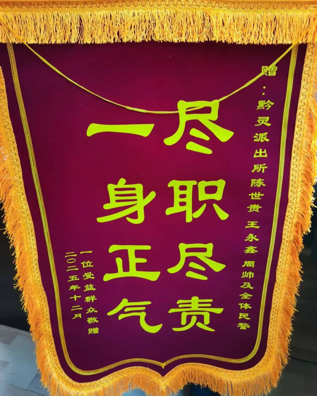 为表达感谢,吴女士专程来到黔灵派出所,送上一面印有“尽职尽责、一身正气”的锦旗。